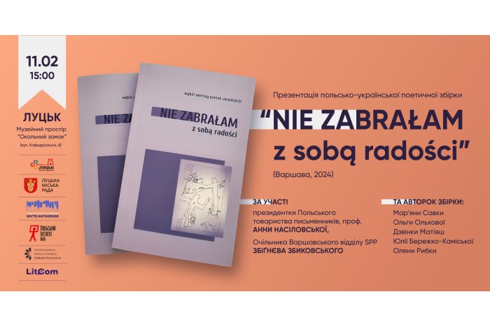 Луцька літературна резиденція запрошує на презентацію збірки творів шістьох українських поеток у перекладі відомих польських письменників, яка відбудеться 11 лютого о 15:00 в приміщенні конференц-залу Музейного простору «Окольний замок» (вул. Кафедральна, 6).