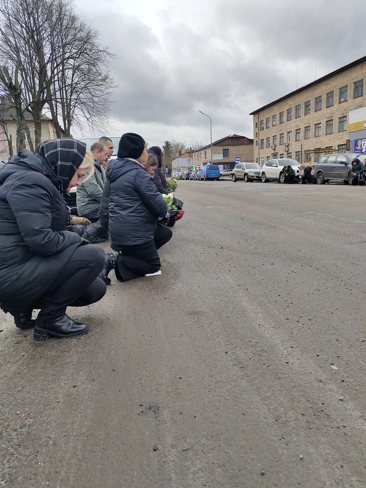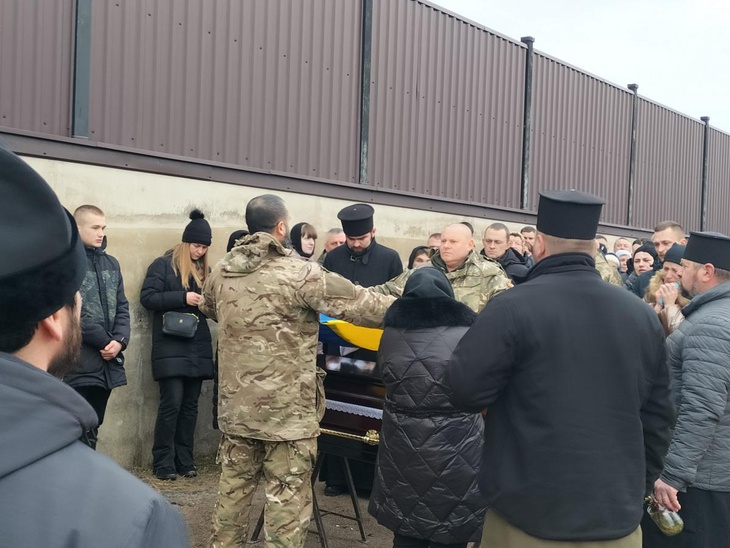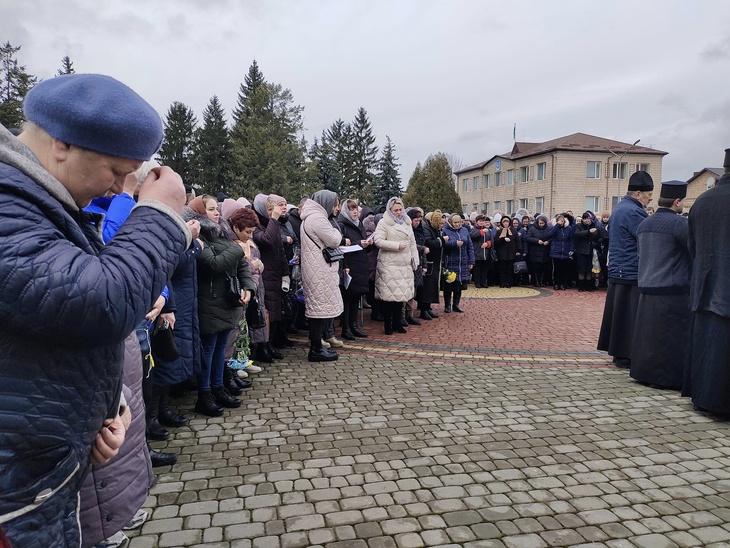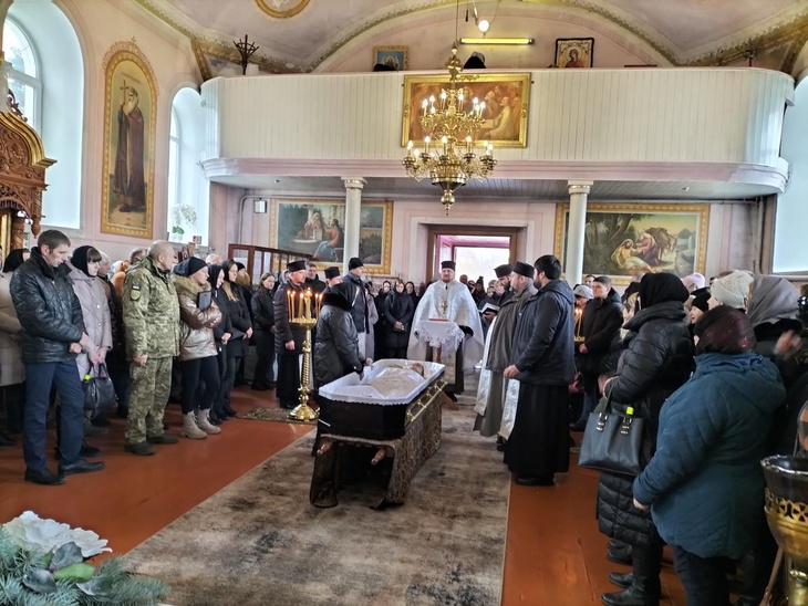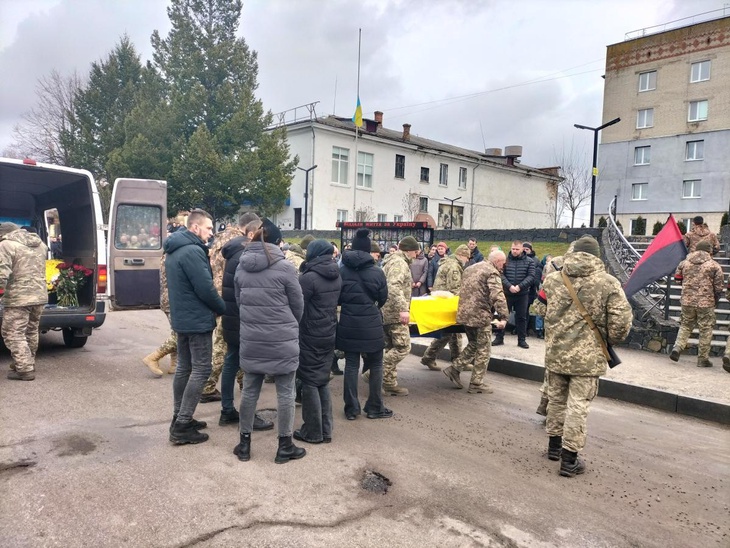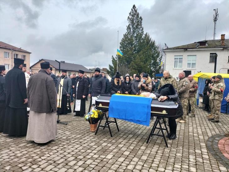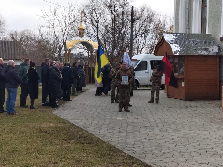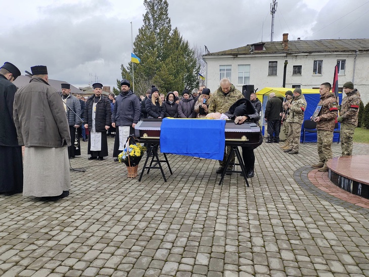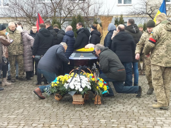 Сьогодні, 8 лютого, біля пам'ятного знака Борцям за волю та незалежність України відбулася громадська панахида за загиблим. Довгою вервечкою тягнуться до домовини, оповитої синьо-жовтим стягом, люди, аби віддати останню шану нашому захиснику. Море квітів, сліз, скорботи.