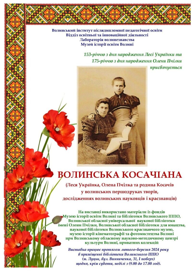 У Волинському інституті післядипломної педагогічної освіти до 153-ї річниці з дня народження Лесі Українки та 175-річчя з дня народження Олени Пчілки відкрито тематичну книжкову виставку «ВОЛИНСЬКА КОСАЧІАНА: Леся Українка, Олена Пчілка та родина Косачів у волинських першодруках творів, дослідженнях волинських науковців і краєзнавців», підготовлену відділом освітньої та інноваційної діяльності.