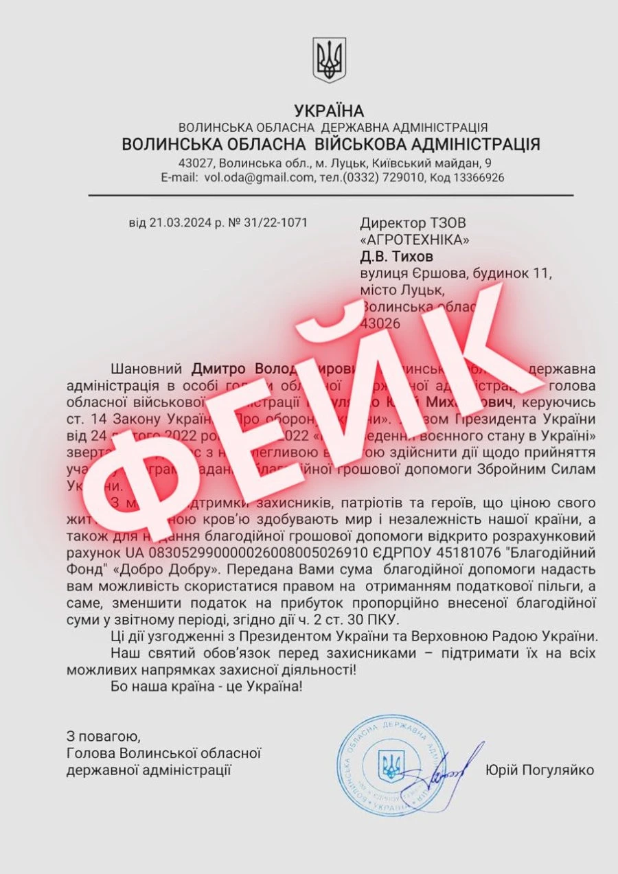 «До підприємців Волині знову надходять листи аферистів від його імені, як начальника Волинської ОВА, з проханням перерахувати благодійні кошти на рахунки фондів з метою допомоги ЗСУ. Натомість шахраї обіцяють «право на отримання податкової пільги». Наголошую, що при отриманні таких звернень чи телефонних дзвінків – відразу повідомляйте правоохоронні орган», - заявив Погуляйко.