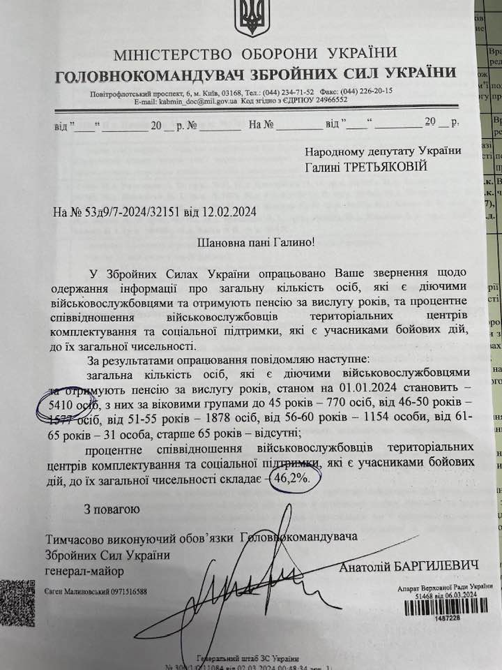 Нардепка показала відповідь Міноборони на її звернення щодо кількості учасників бойових дій серед співробітників ТЦК. У ній сказано, що процентне співвідношення військовослужбовців територіальних центрів комплектування та соціальної підтримки, які є учасниками бойових дій, до їх загальної чисельності складає 46,2%.