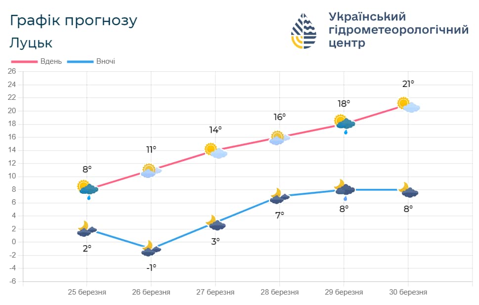 Починаючи з 27 березня, вночі 3-8⁰ тепла, вдень 13-18⁰ тепла.
