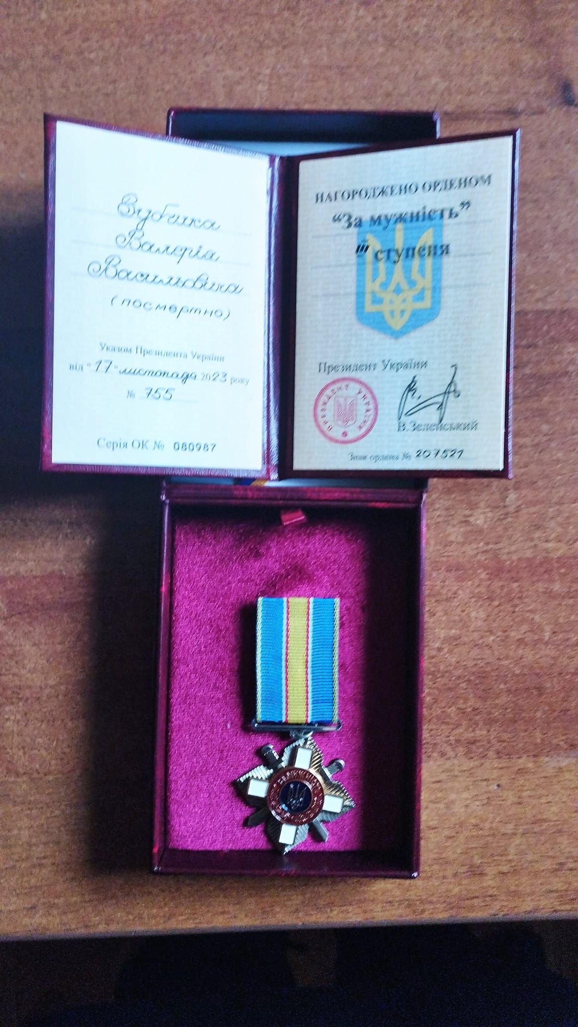 «Відповідно до Указу Президента України від 17 листопада 2023 року № 755, вручили орден «За мужність» ІІІ ступеня дружині загиблого військовослужбовця Валерія Зубчика, який загинув 29 вересня 2023 року, виконуючи бойове завдання на Луганщині», - йдеться у повідомленні.