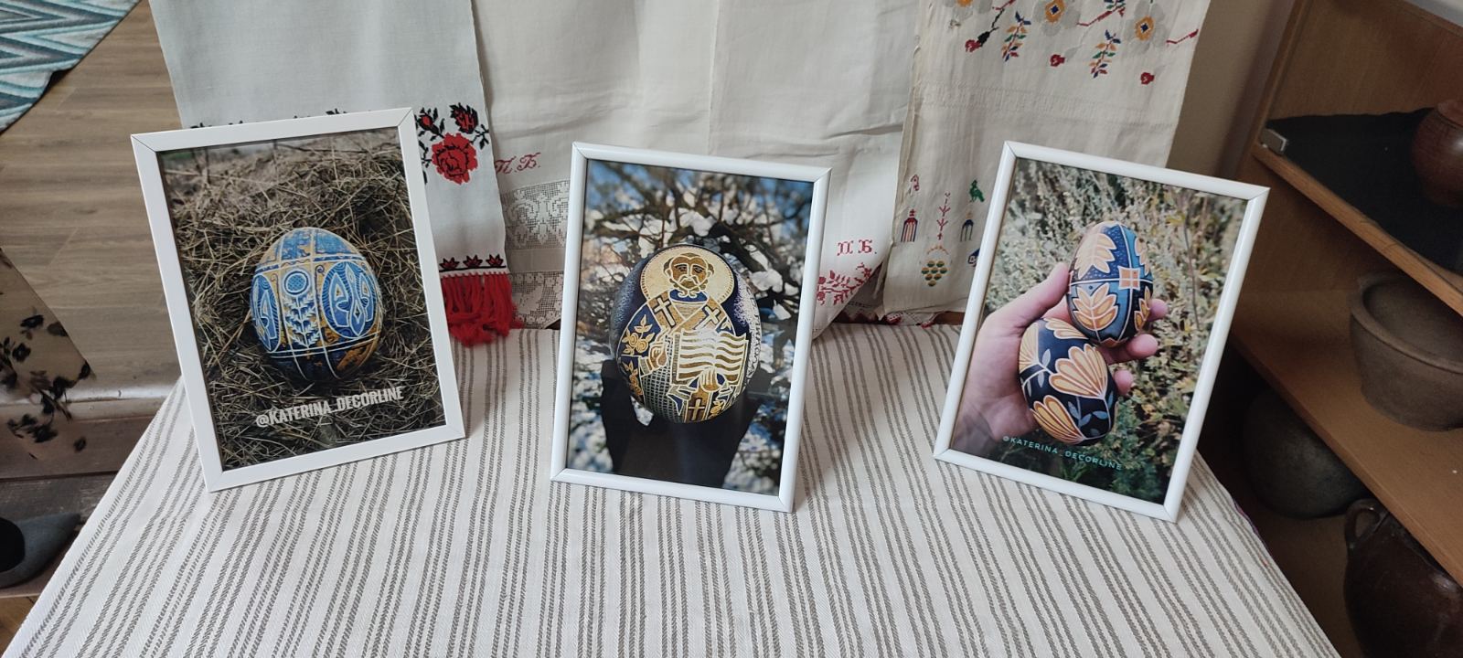 Свої шедеври Катерина створює на яйцях від різних птахів, проте надає перевагу курячим, гусячим, індичим та страусиним. В мистецьких колах своєрідним табу є на розпис голубиних яєць, оскільки голуб - це символом Святого Духу, символ Миру, тож забороняється руйнувати їхні гнізда…