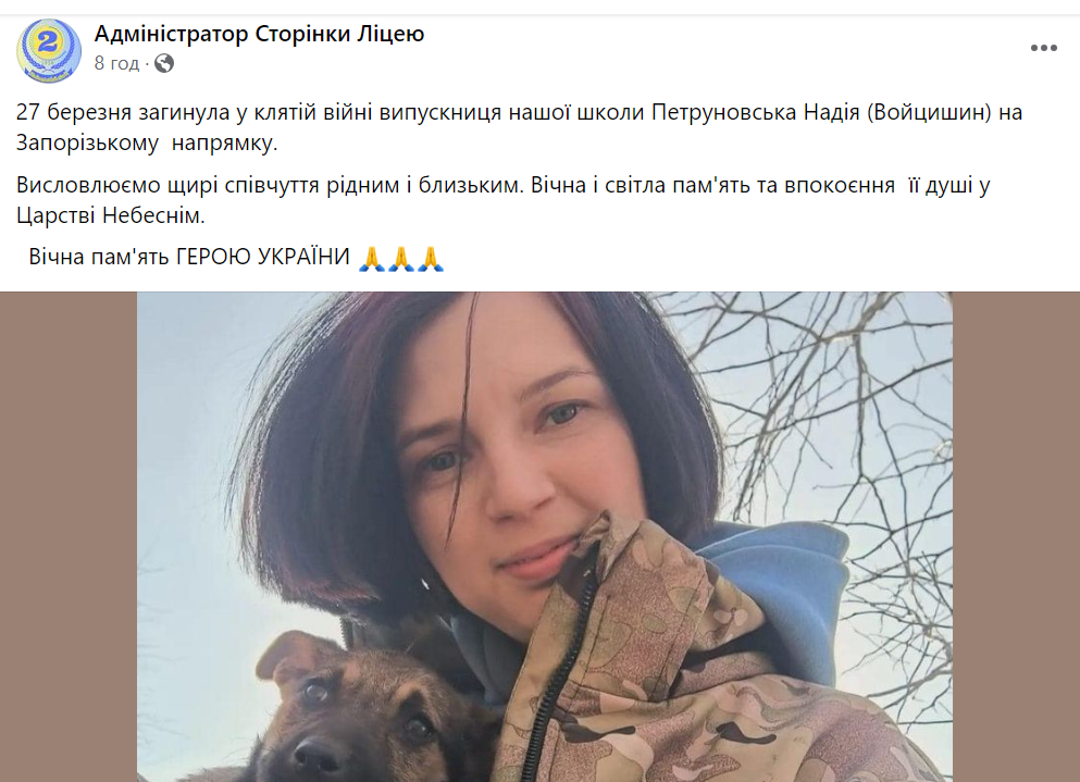 27 березня на Запорізькому напрямку загинула випускниця Любомльської ліцею №2 Петруновська Надія (Войцишин).