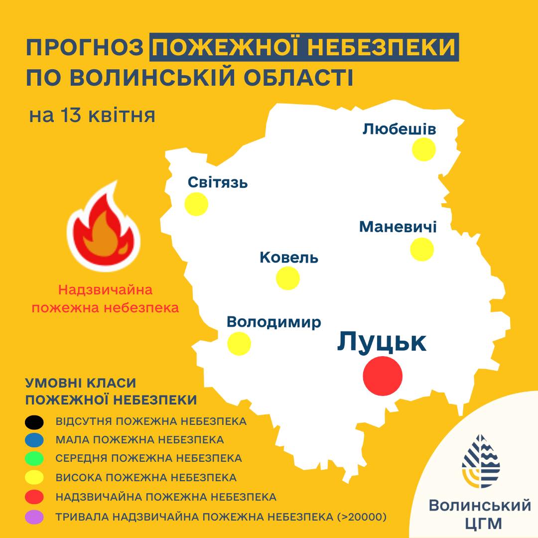 13 квітня в південно-східній частині Волинської області прогнозують надзвичайний рівень пожежної небезпеки.