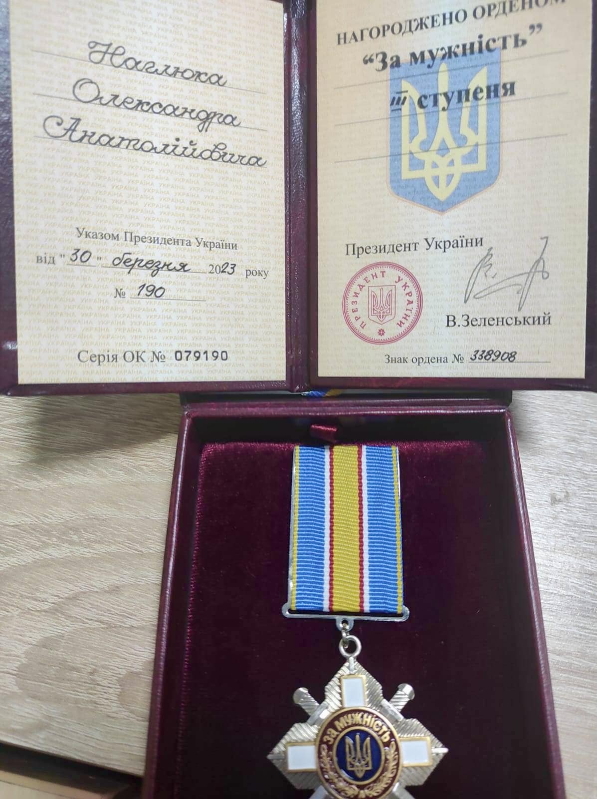 Відповідно до Указу Президента України від 30.03.2023 року №190 орденом «За мужність» ІІІ ступеня нагороджено Олександра Наглюка. Нагороду отримала матір військовослужбовця Тамара Наглюк.