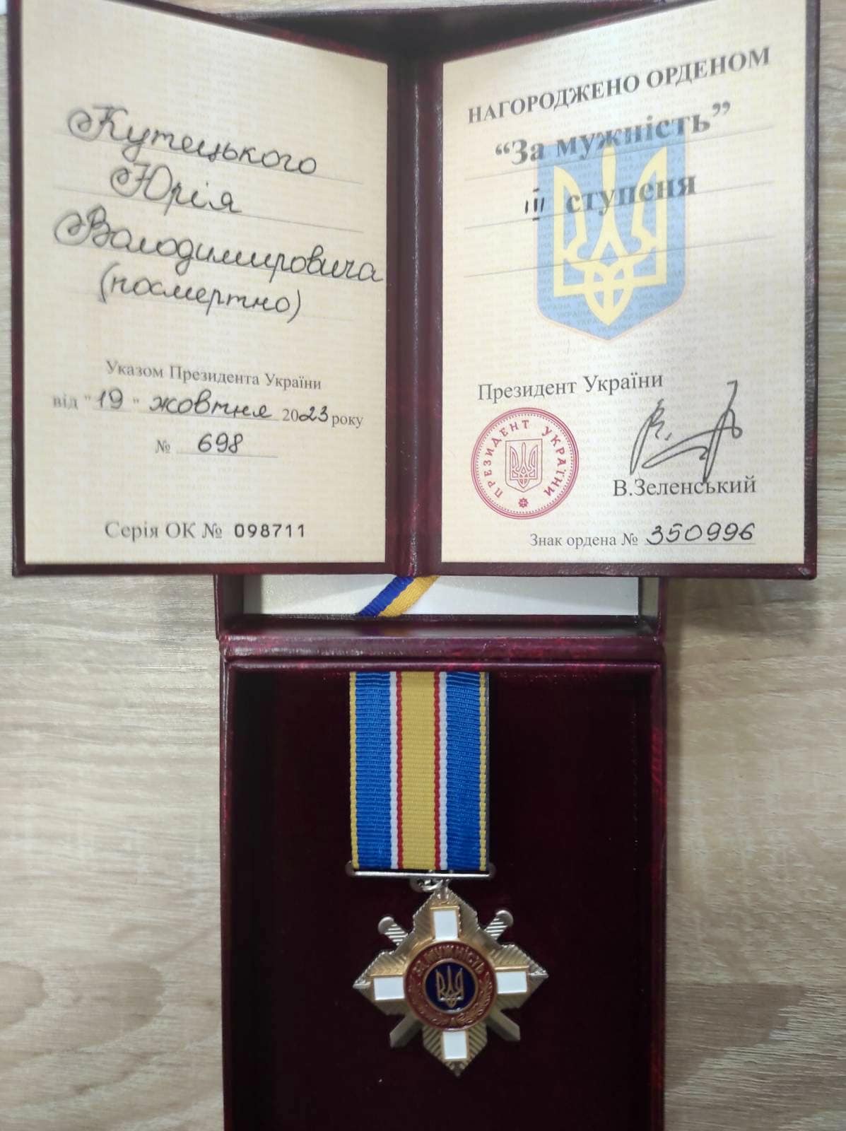 Відповідно до Указу Президента України від 19.10.2023 року №698 орденом «За мужність» ІІІ ступеня нагороджено Юрія Кутецького (посмертно). Нагороду отримала дружина військовослужбовця Вікторія Кутецька.