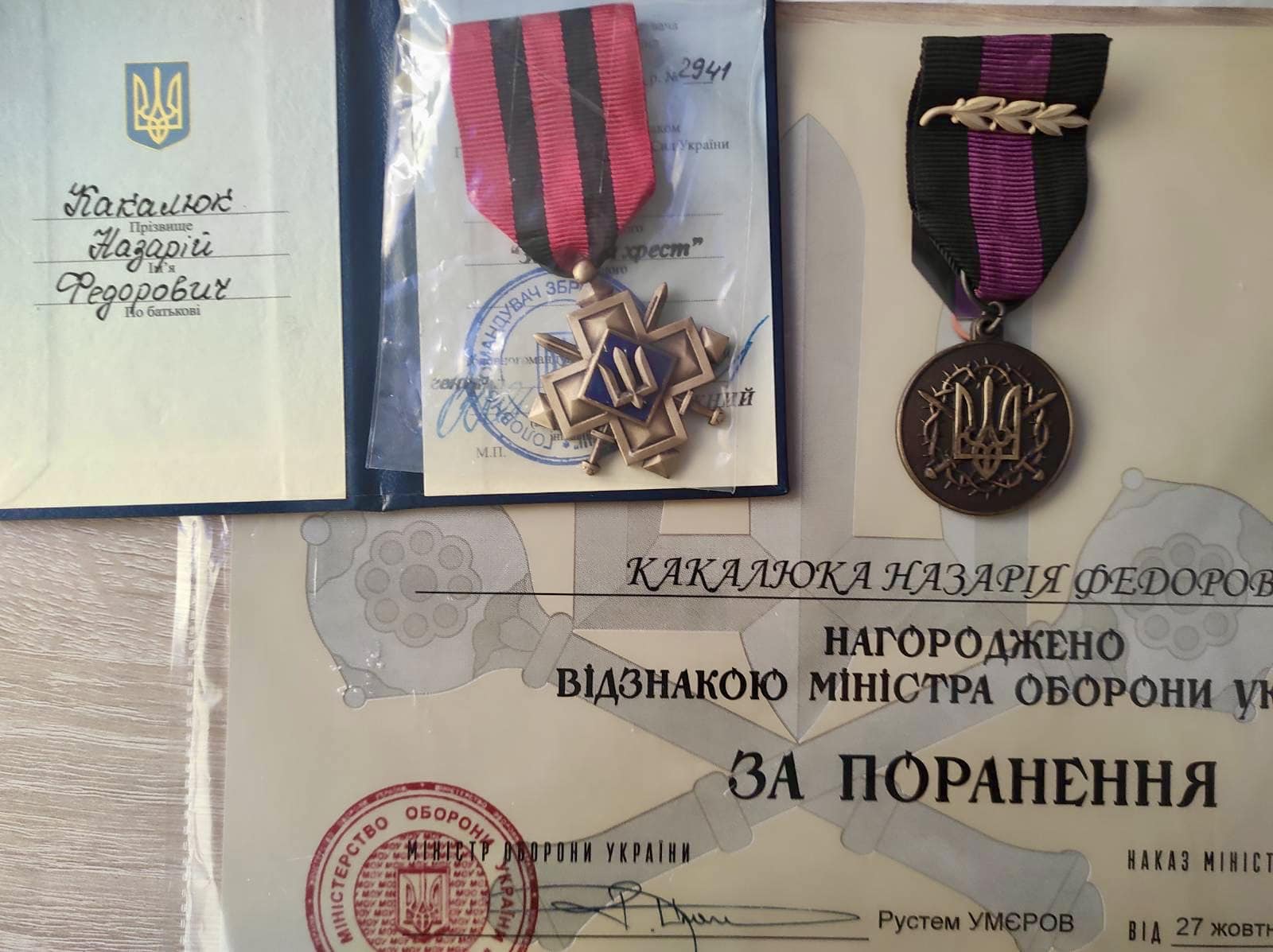 Відповідно до Наказу Міністра оборони України від 27.10.2023 року №340 медаллю «За поранення», а також відповідно до Наказу Головнокомандувача Збройних Сил України від 09.12.2023 року №2941 почесним нагрудним знаком «Золотий хрест» нагороджено військовослужбовця Назарія Какалюка.