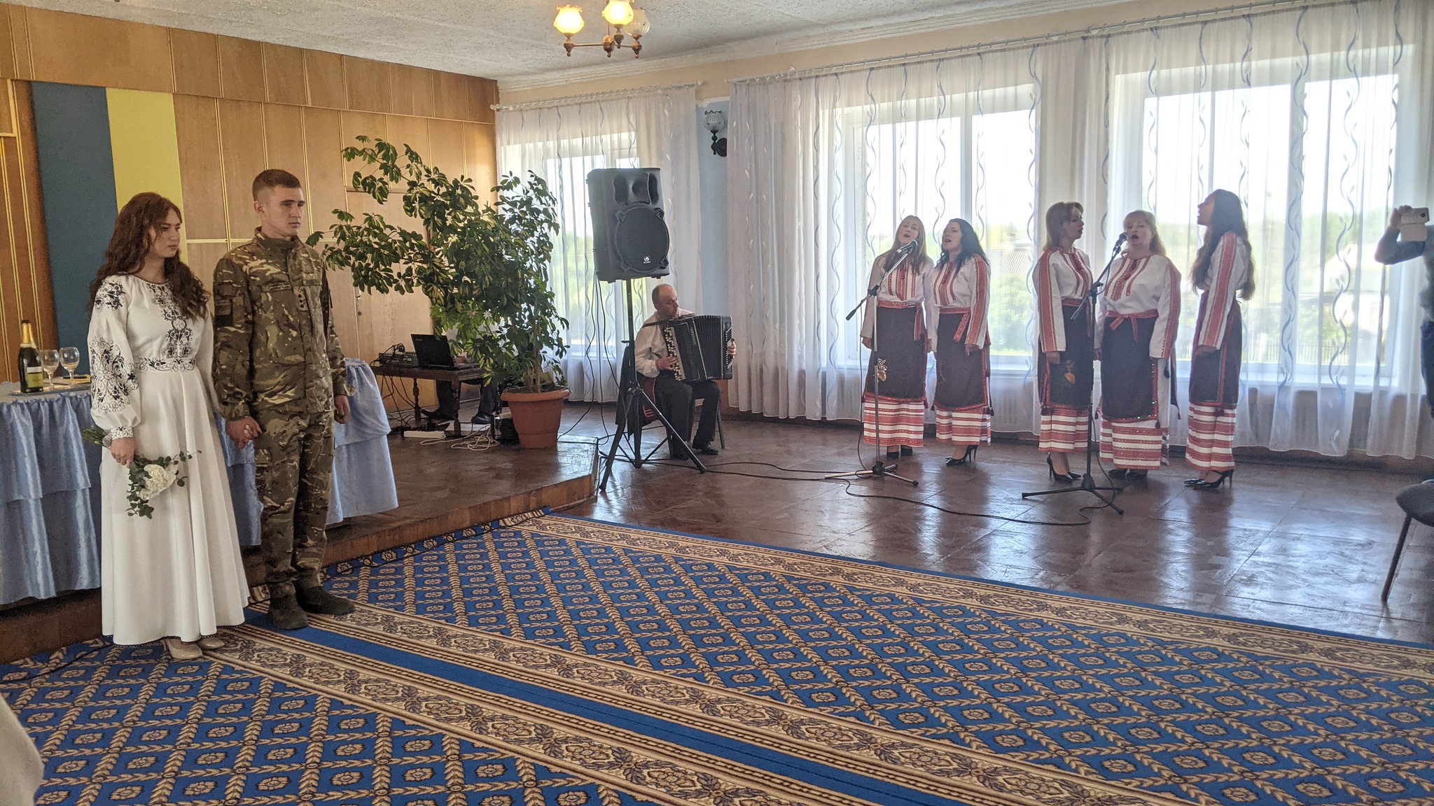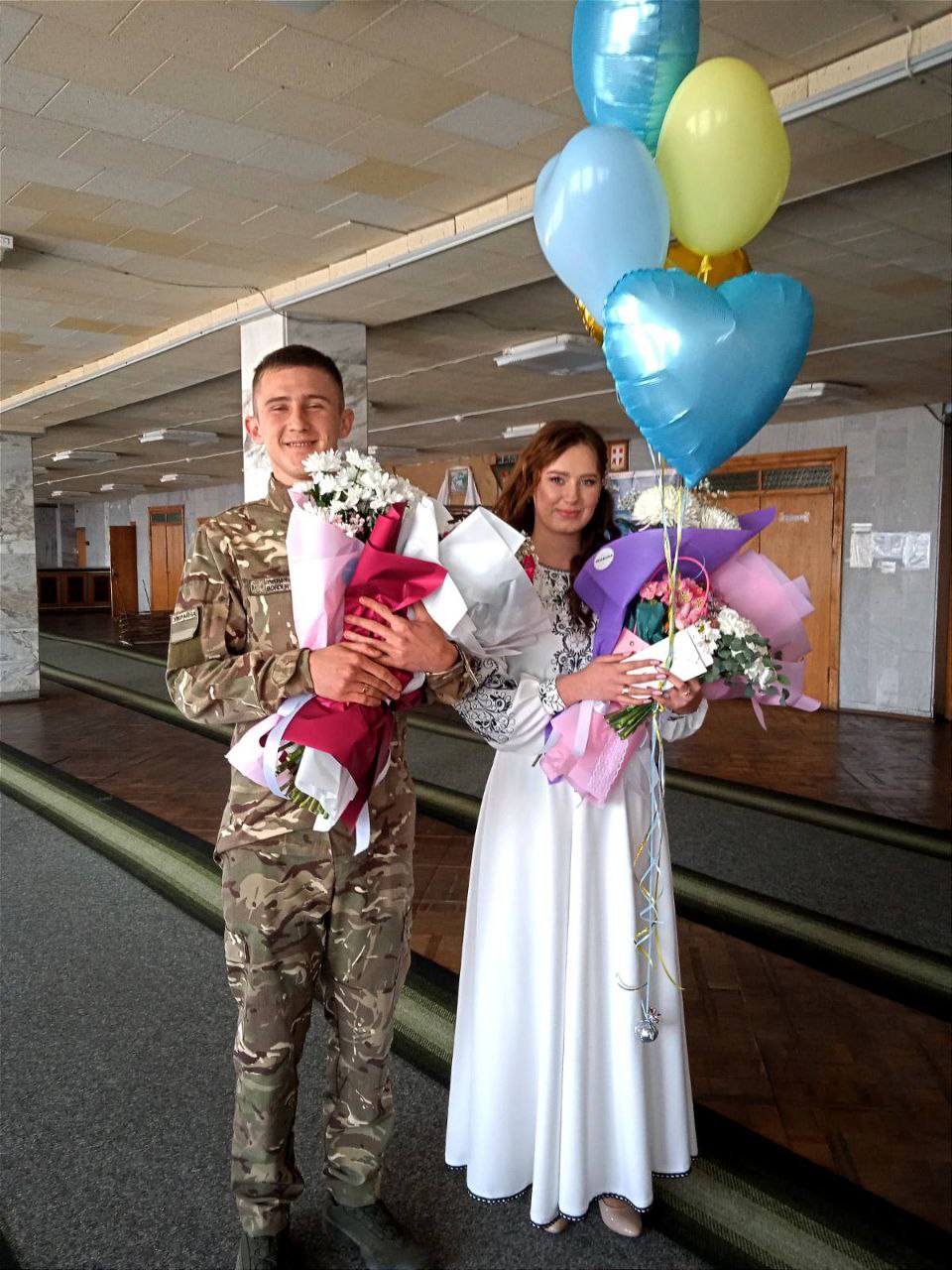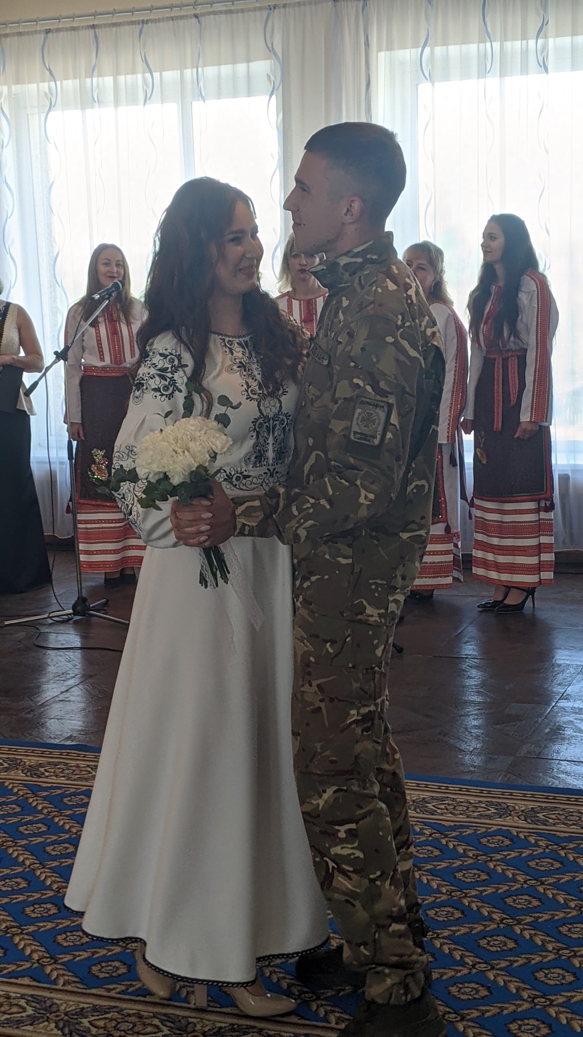 Це пам’ятна подія для закоханих, котрі за традицією стали на весільний рушничок щастя. Молода – у шлюбній вишиваній сукні, а молодий у своєму військовому однострої.