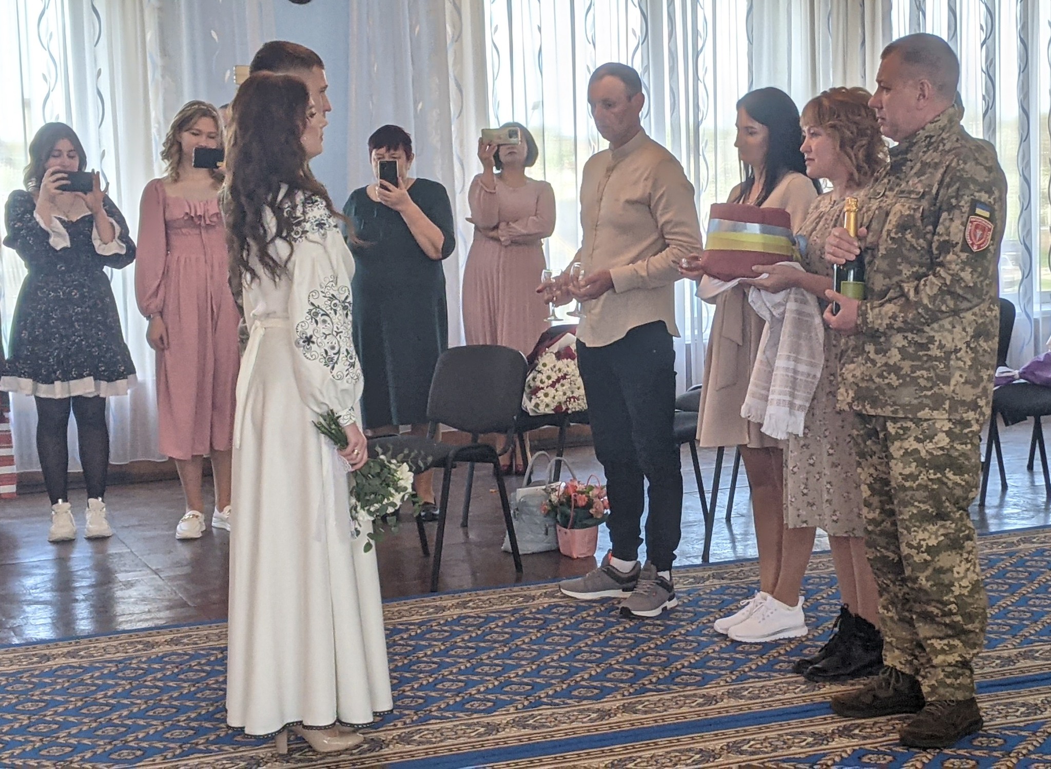 Закохані обмінялися шлюбними обручками, традиційно випили келих шампанського вина, скріпили своє рішення підписами та отримали від рідних, друзів, побратимів-захисників святкові привітання та побажання.