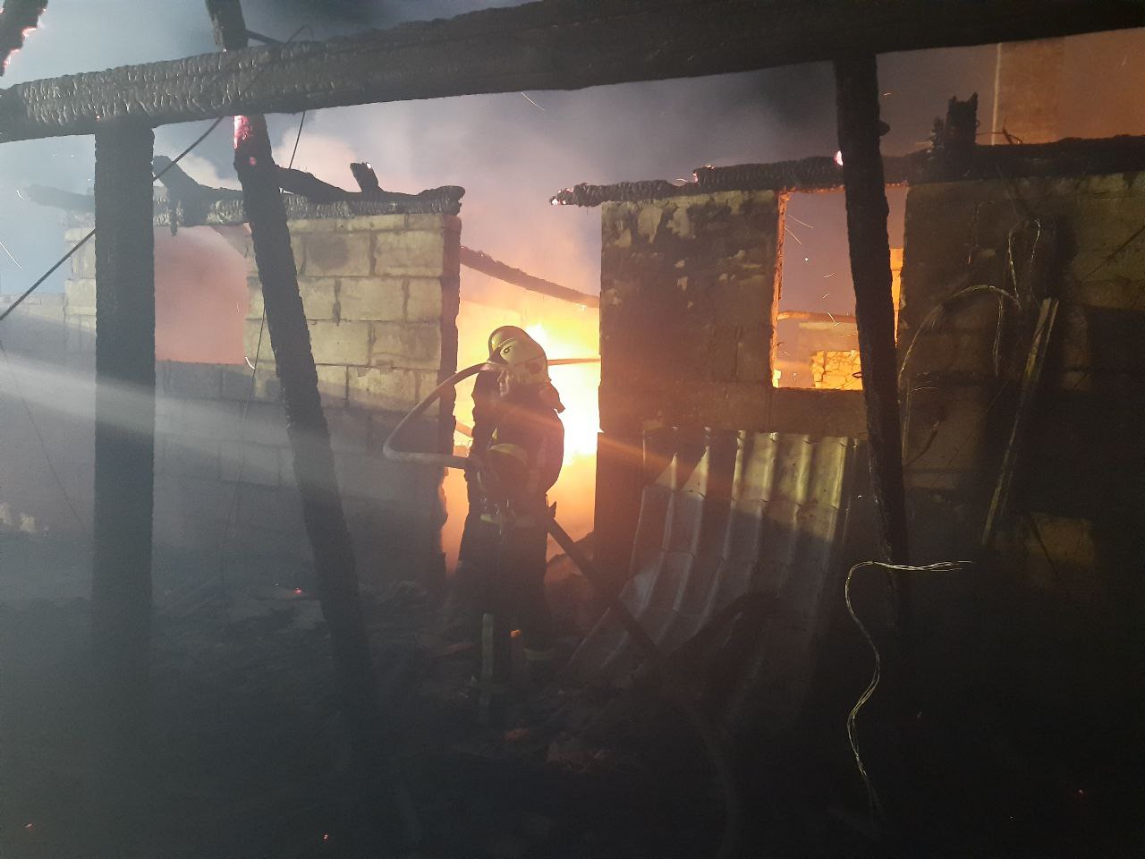 Пожежею знищено значну частину покрівлі та перекриття, пошкоджені стіни та продукція в одноповерховій будівлі з блоків, розміром 15х30 м, критій металевим листом.