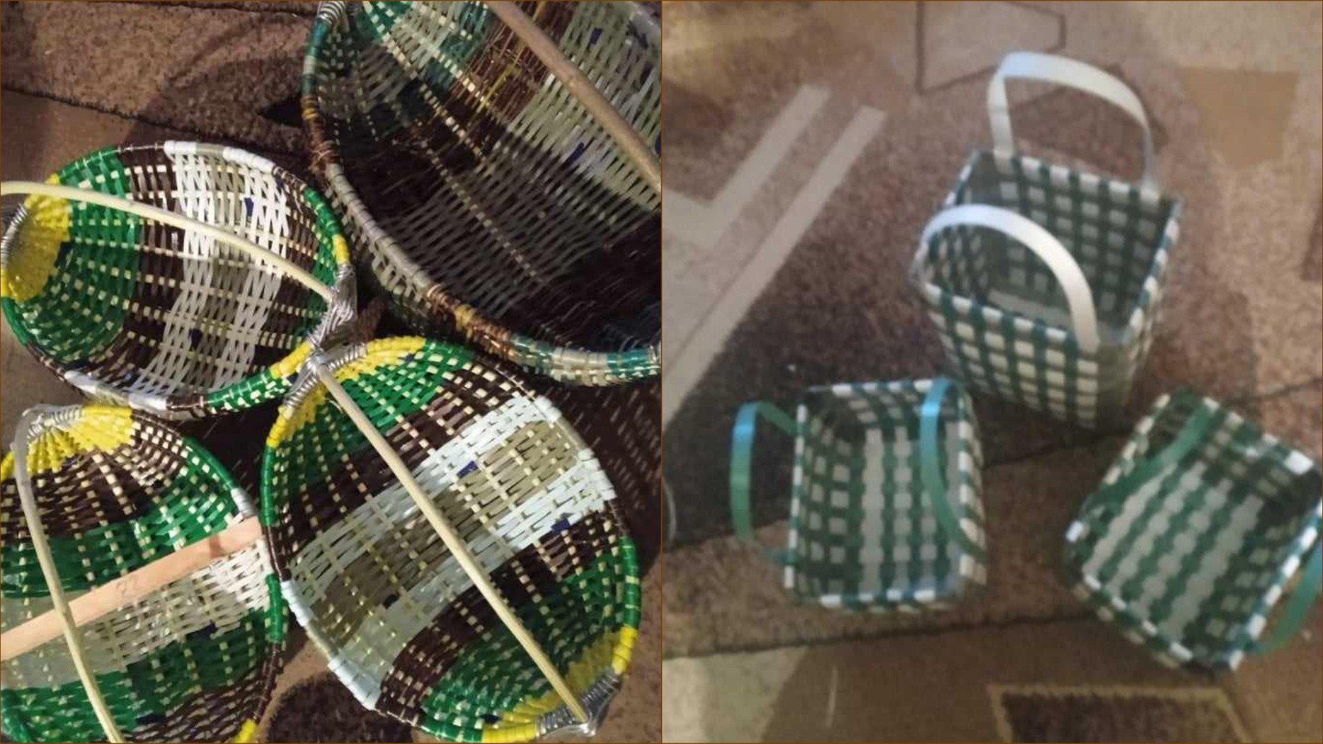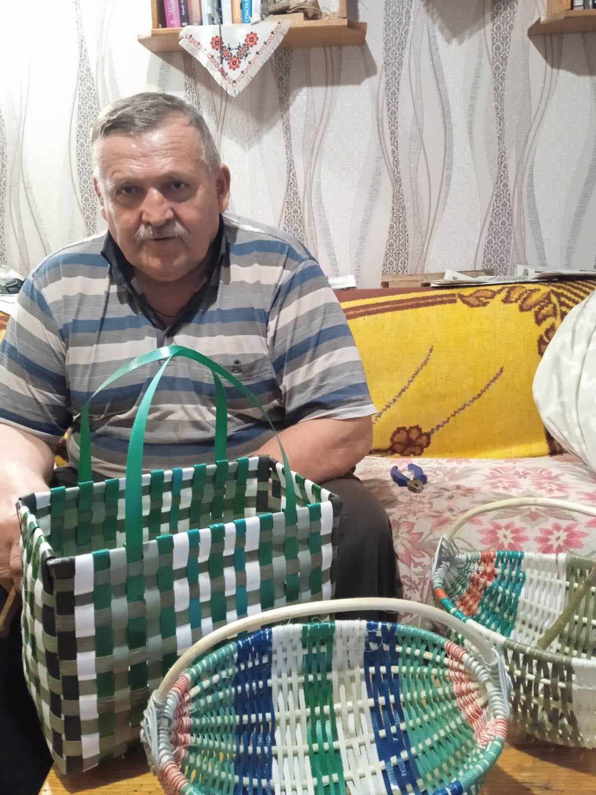Для плетіння пан Володимир використовує різні матеріали: коріння сосни, лозу і сучасну пластикову стрічку, яка дуже легка і довговічна. Зі стрічки плете і корзини різного розміру, які має на продаж.