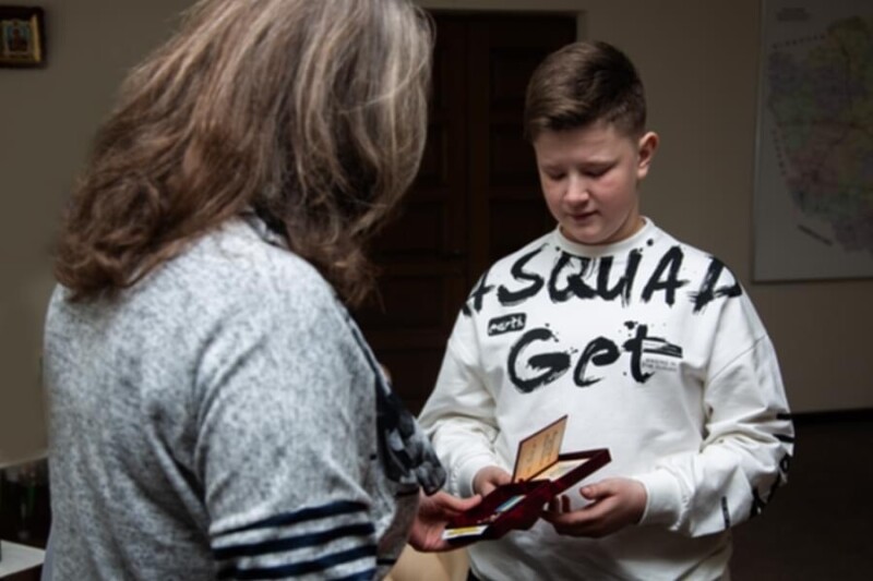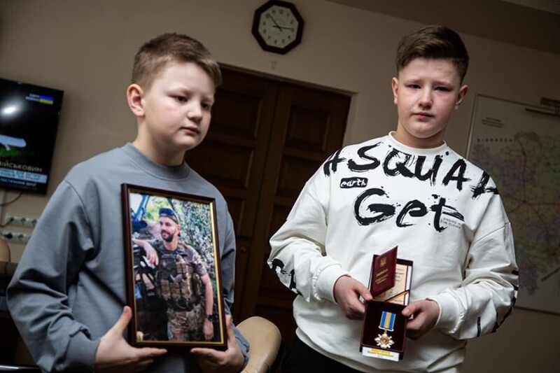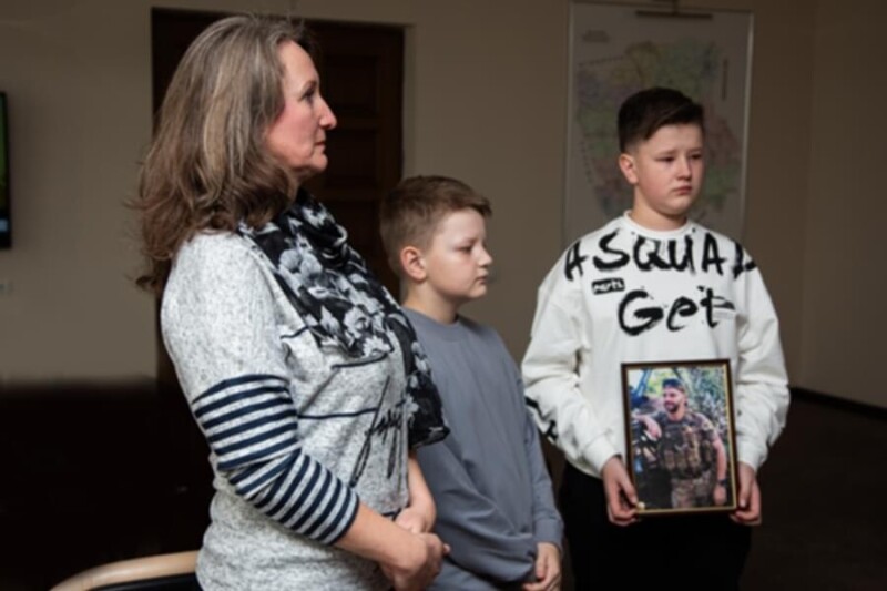 Державну нагороду начальник ОВА Юрій Погуляйко передав синам Героя Матвію і Захарію та дружині.