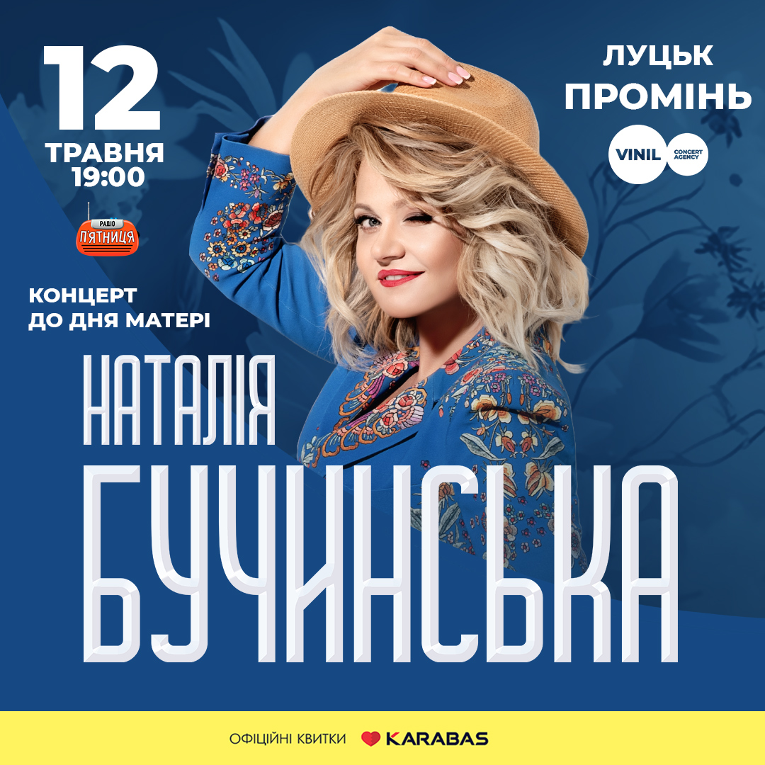 Прекрасна та запальна народна артистка України Наталія Бучинська готує неймовірну концертну програму до найтеплішого свята в році – Дня матері. Концерт відбудеться 12 травня у РЦ "Промінь".
