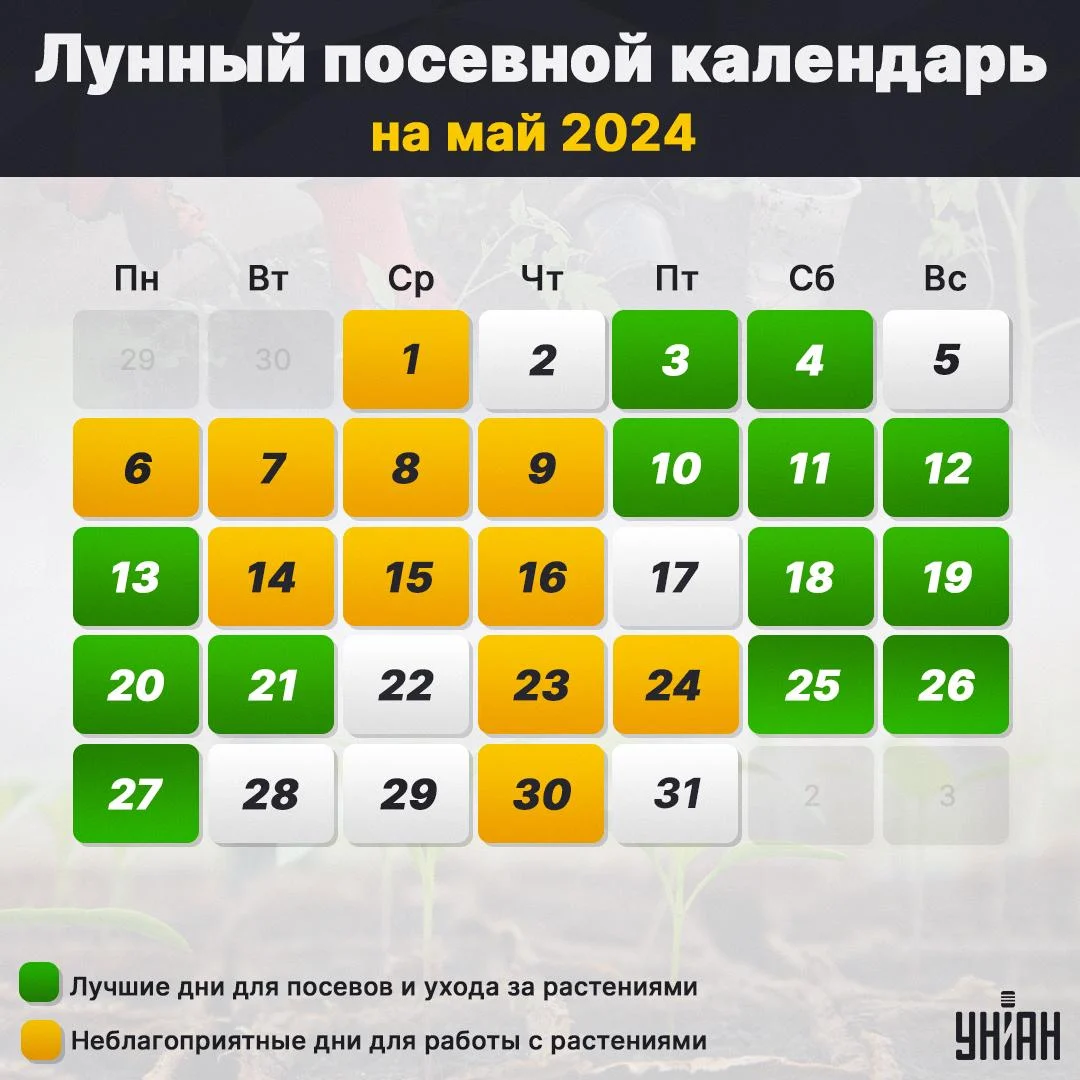 Роботи на ділянках стає дуже багато і грамотно розпланувати всі необхідні процедури допоможе місячний посівний календар на травень 2024. Він назве врожайні та невдалі дати для посівів, а також підкаже, чим зайнятися на ділянці в кожен день.
