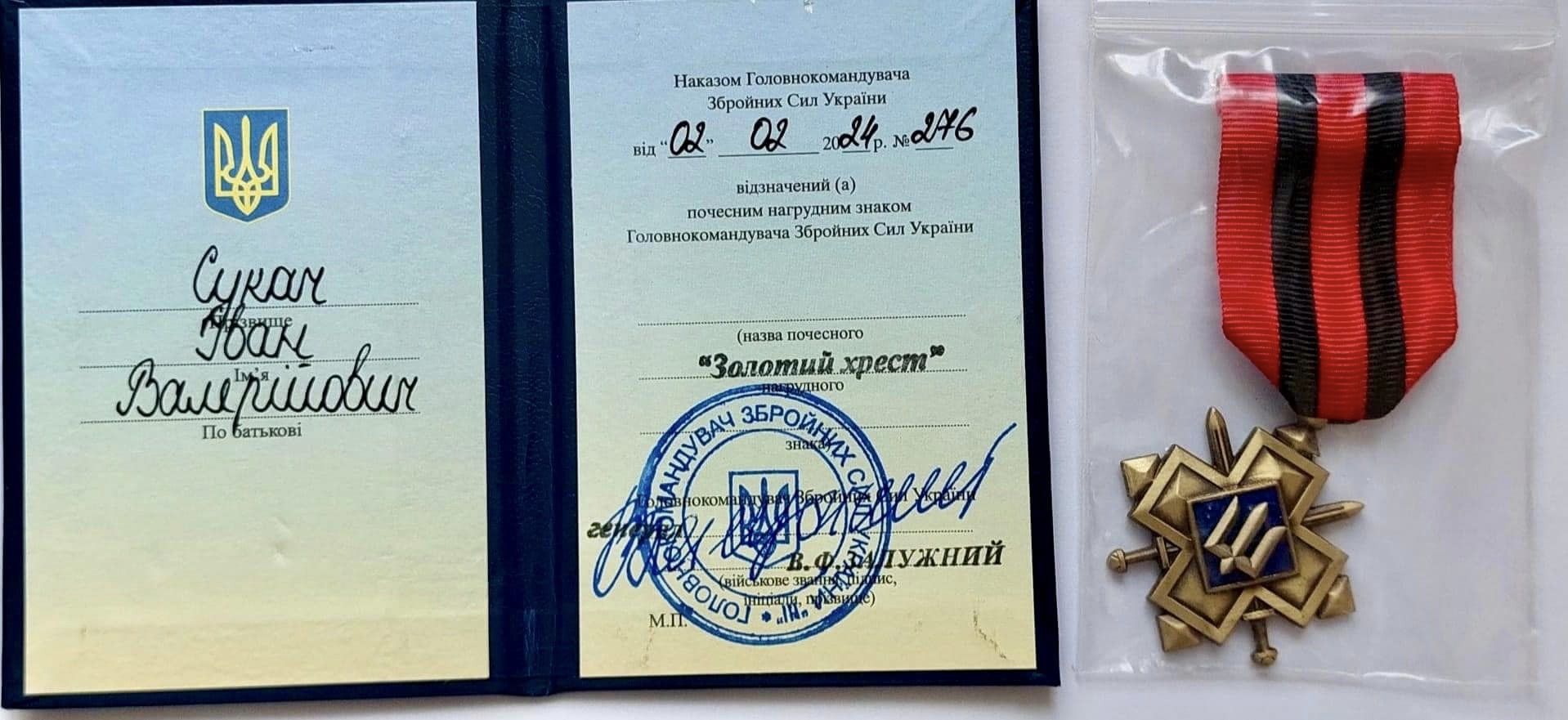 Почесний нагрудний знак Головнокомандувача Збройних Сил України «Золотий Хрест» вручили його мамі Лідії, татові Валерію та синові В’ячеславу Сукачам, - йдеться