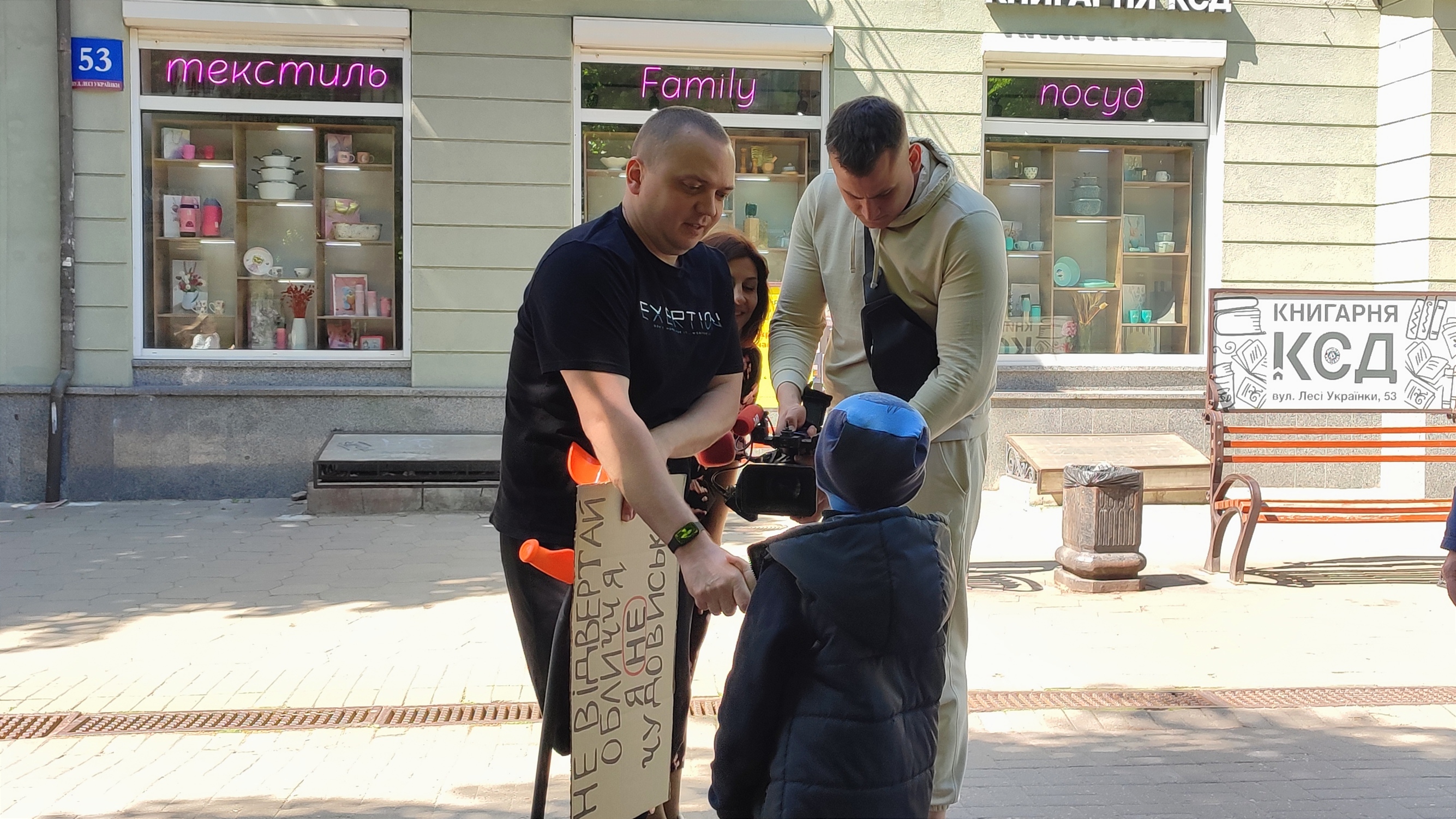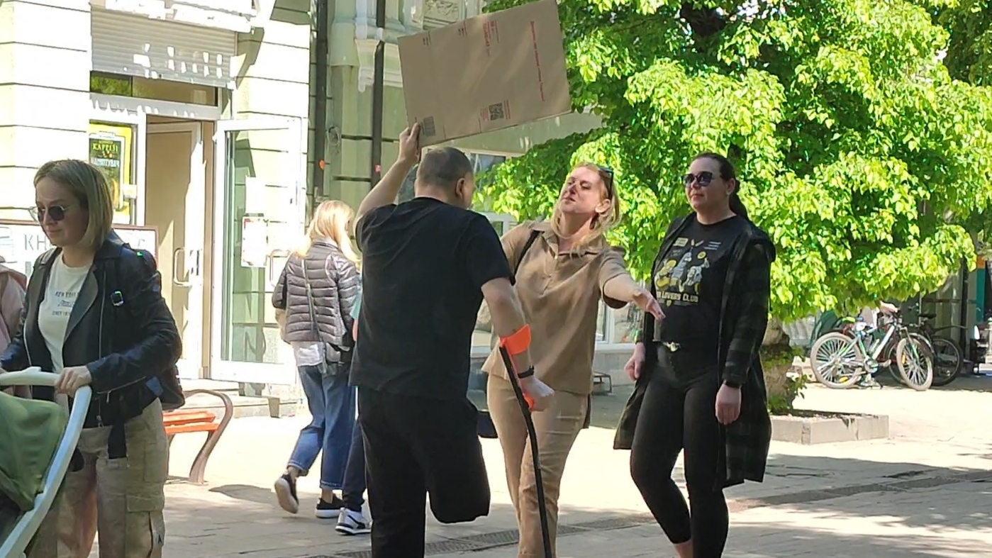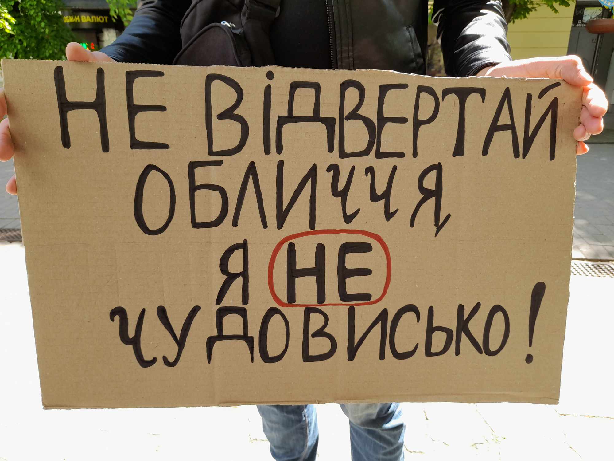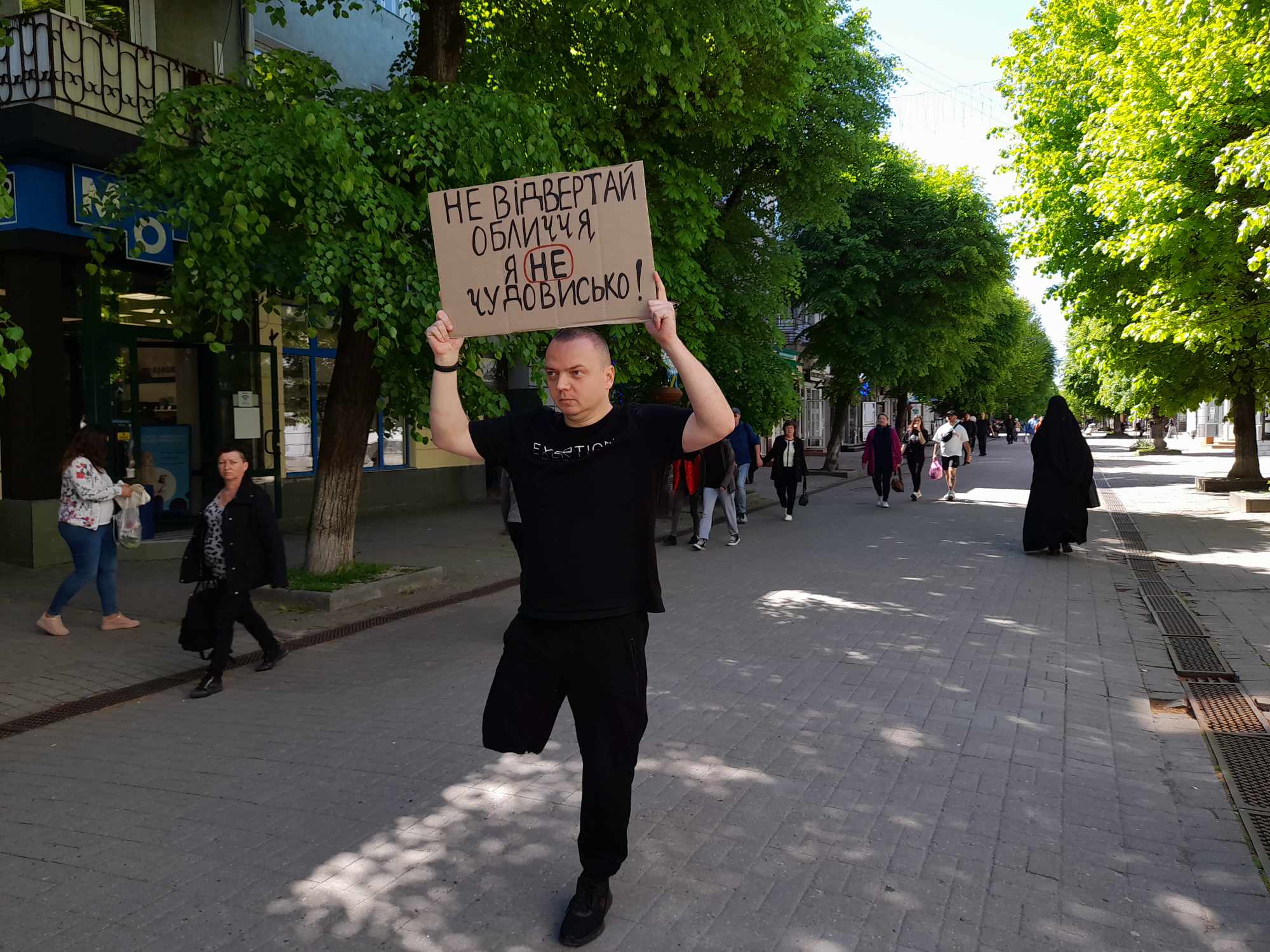 Євген Сивопляс стояв без милиць із плакатом, на якому був надпис: «Не відвертай обличчя. Я не чудовисько!» та спостерігав за реакцією перехожих.