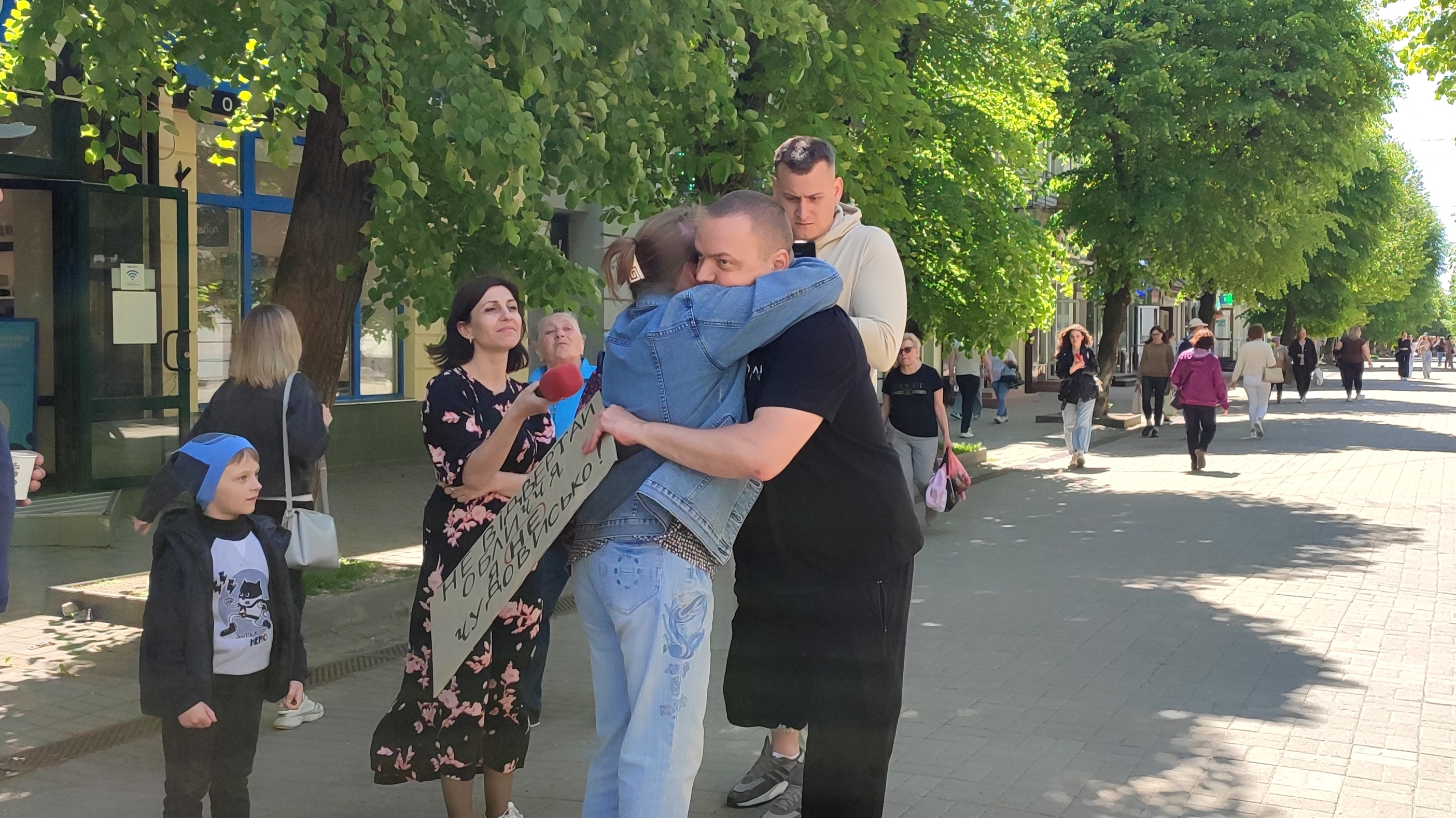 Одна з перехожих, яка підійшла і обійняла військового, поділилась своєю думкою щодо реакції суспільства стосовно цієї проблеми:
