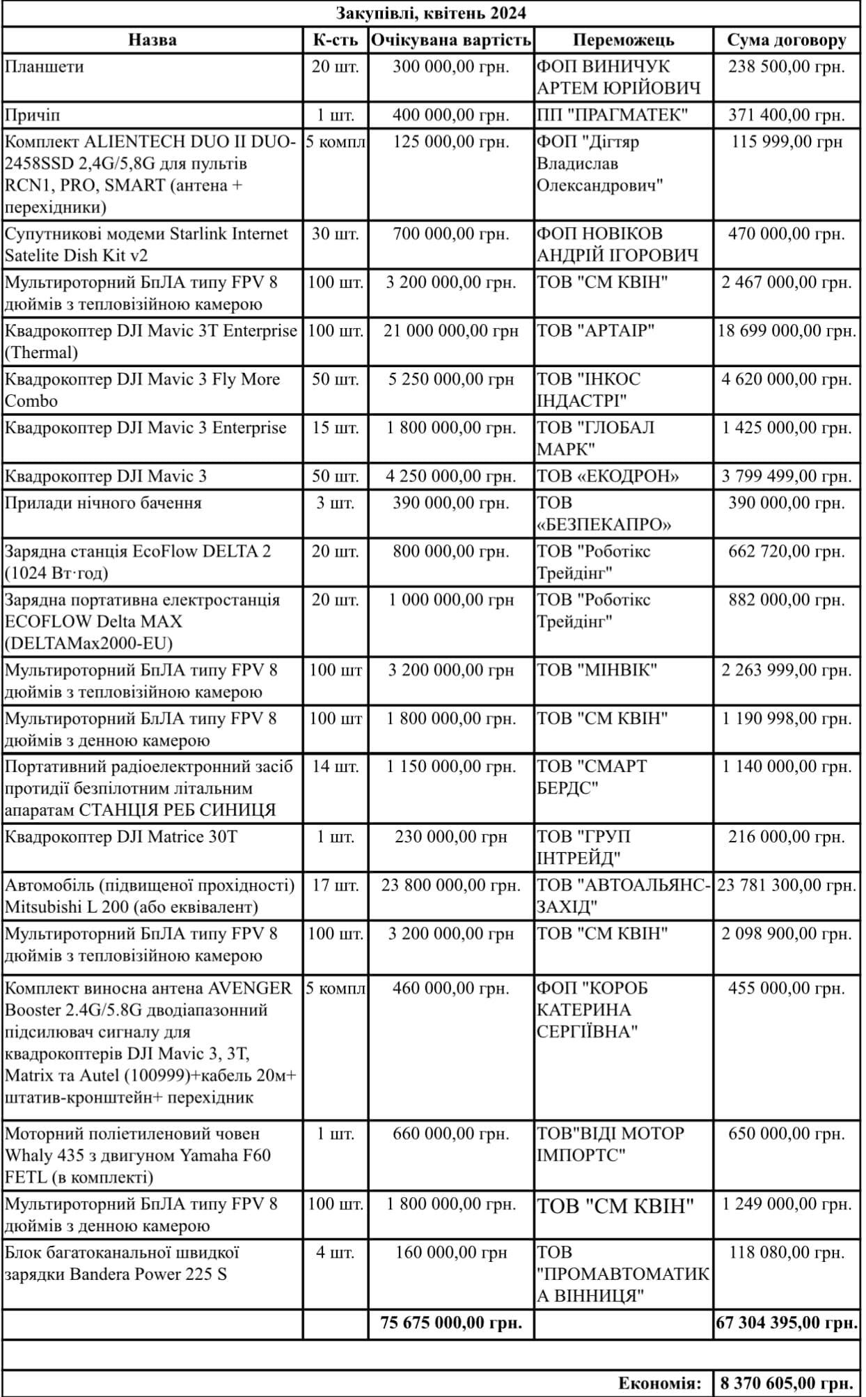 «Звітуємо по закупівлях для ЗСУ за квітень. Оголошено закупівель на 75 675 000,00 грн. Внаслідок проведення відкритих торгів зекономлено 8 370 605,00 грн. Укладено договорів на суму 67 304 395,00 грн», - йдеться у повідомленні.