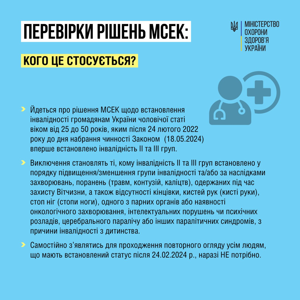 «Самостійно з'являтися для проходження повторного огляду всім людям, які мають встановлений статус після 24.02.2024, станом на зараз не треба», - наголосили в МОЗ.