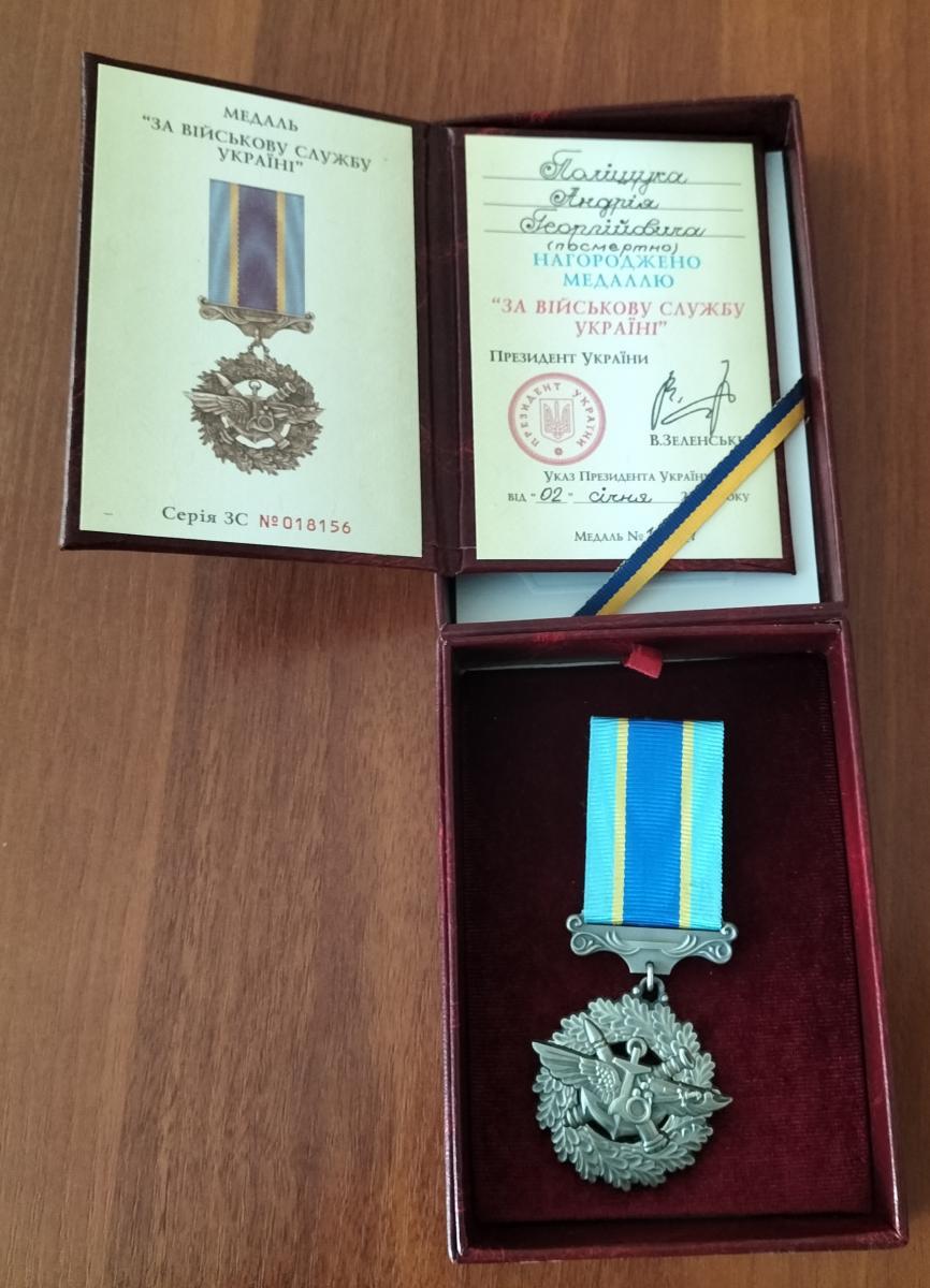 «За особисту мужність, виявлену у захисті державного суверенітету та територіальної цілісності України, самовіддане виконання військового обов’язку, відповідно до Указу Президента України №2/2024 від 2 січня 2024 року солдата Андрія Георгійовича Поліщука нагороджено медаллю “За військову службу Україні” (посмертно)», - йдеться у дописі.
