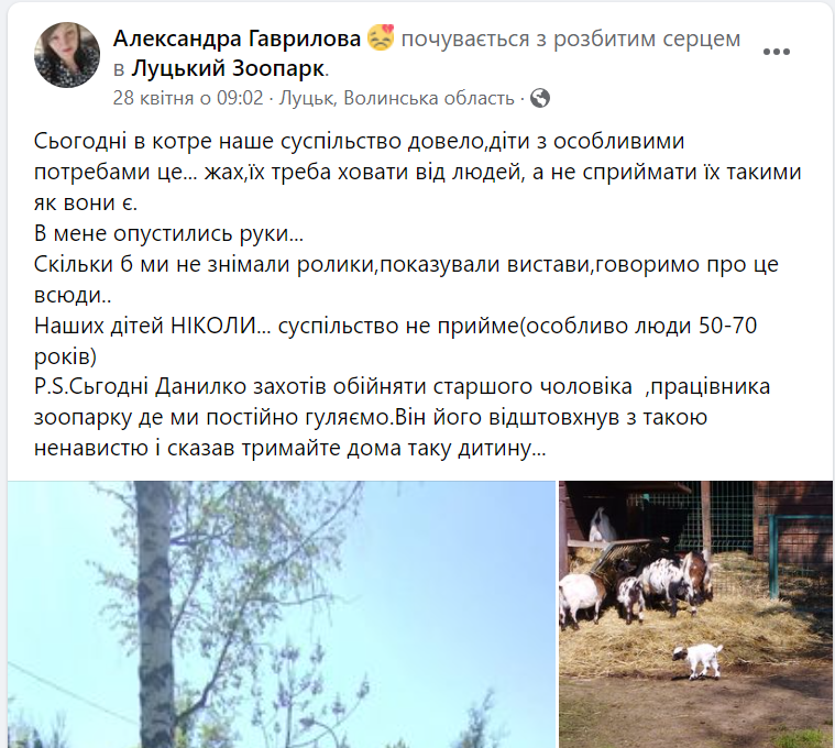 Відомо, що відвідувачка у фейсбуці написала пост, де заявила, що працівник зоопарку нібито відштовхнув з ненавистю хлопчика з аутизмом і сказав «тримати вдома таку дитину».