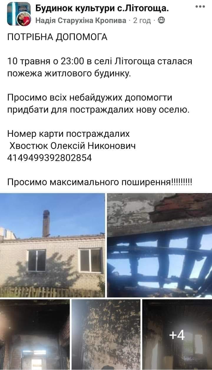 Вночі 10 травня сім'ю Хвостюків спіткало горе - згорів будинок. Односельці закликають громаду відгукнутися та зібрати необхідну суму для купівлі нового житла.