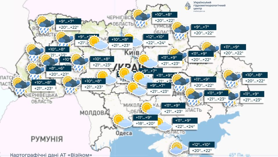 Сьогодні буде без опадів, лише вдень на Лівобережжі та у західних областях місцями короткочасні дощі, грози. Вітер змінних напрямків, 3-8 м/с. Температура вночі 7-12°, вдень 19-24°; у Карпатах вночі 3-8°, вдень 13-18°.