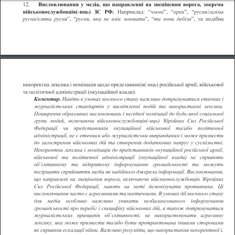 «Поширення образливих висловлювань і негідної номінації до будь-якої соціальної групи людей, включаючи військовослужбовців РФ чи представників окупаційної військової та/або політичної адміністрації, не є етичним або виправданим і може призвести до загострення військових дій та створення додаткових напруг у суспільстві», – пише Нацрада.