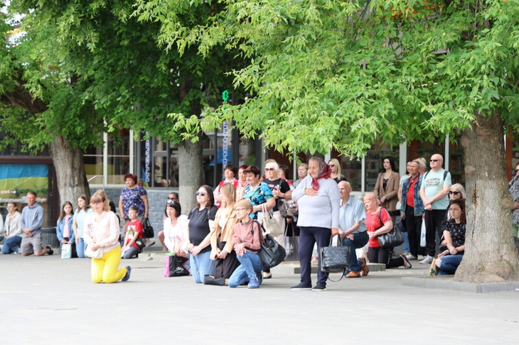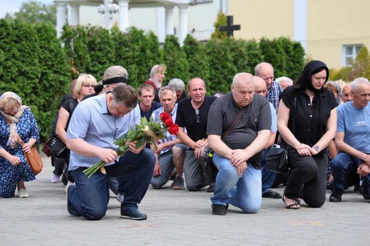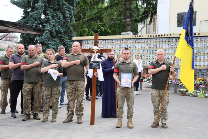 Після завершення богослужіння труну з тілом покійного воїна пронесли Театральним майданом, де лучани стали перед захисником на коліна і схилили голови. Біля пам'ятного фотостенду "Герої Небесної Сотні - Загинули за Єдність України" присутні виконали Державний Гімн України.