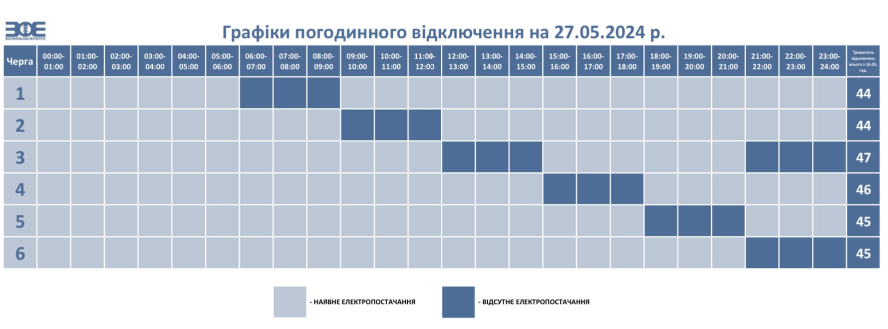 У понеділок 27 травня у Волинській області діятимуть графіки погодинного відключення електроенергії (ГПВ).