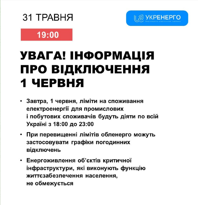 «Завтра, 1 червня, ліміти на споживання електроенергії для промислових та побутових споживачів будуть діяти по всій території України. Обмеження будуть застосовані з 18:00 до 23:00 години», – повідомили в компанії.