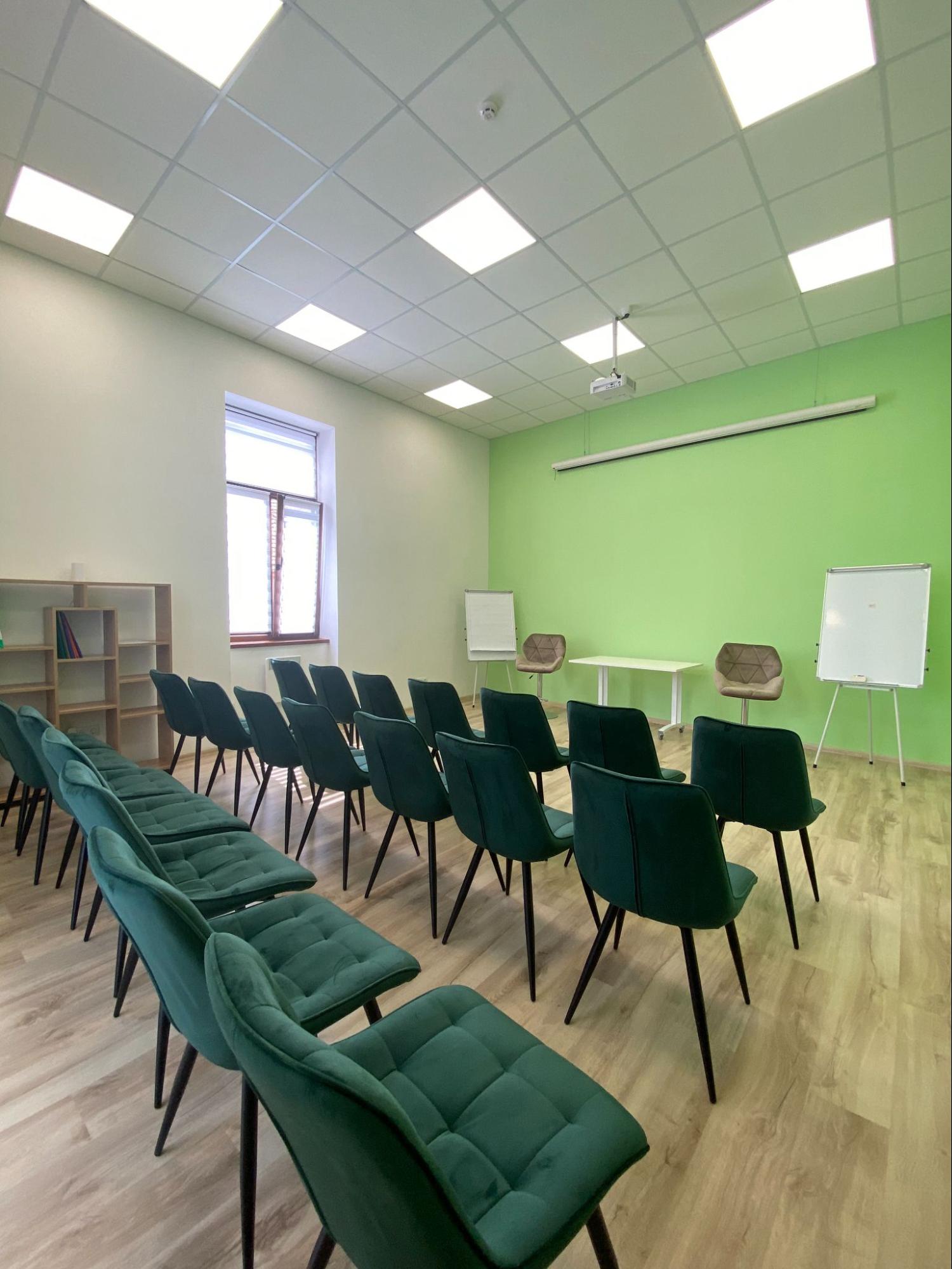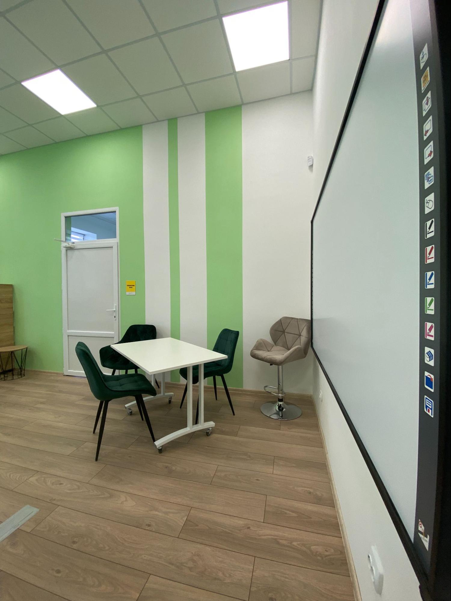 Також у хабі є зала для тренінгів, щоб люди могли комфортно проходити навчання, і переговорна кімната, де можна працювати за комп’ютером. Ще одна кімната — для творчості: з інтерактивною дошкою та зручними сидіннями.