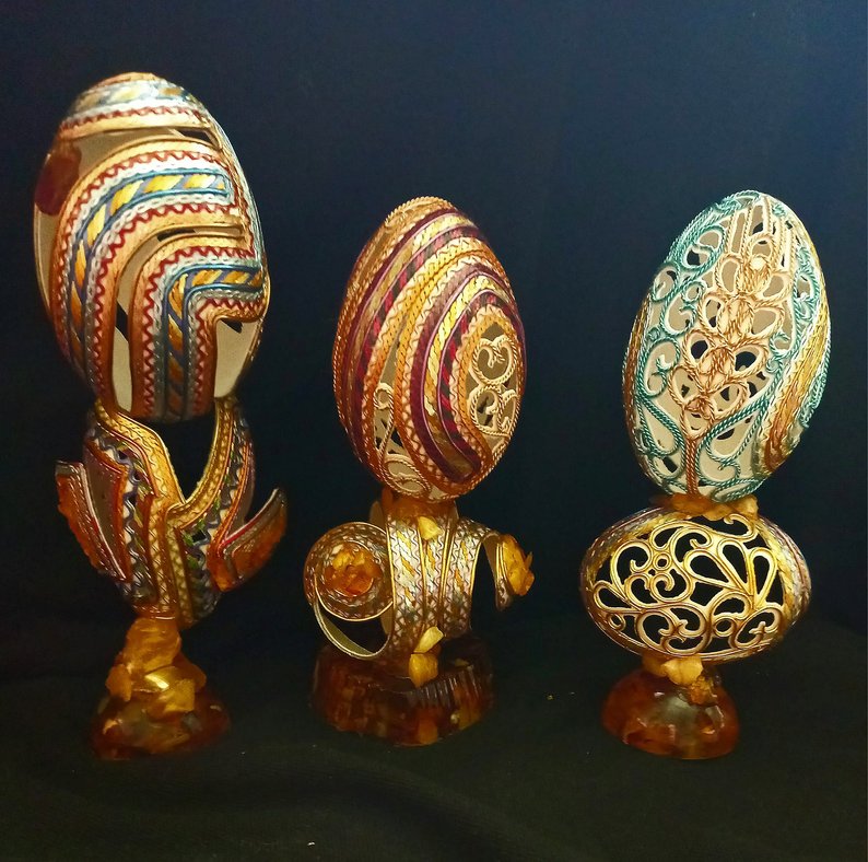 Про це волинянин розповів у коментарі Суспільному. З його слів, серія складається із шести різних робіт, виготовлених із яєчних шкаралуп і оздоблених кольоровими художніми металами.
