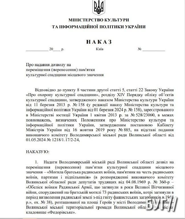 Міністерство культури та інформаційної політики України видало наказ про надання дозволу на перенесення обеліска слави із площі Героїв у Володимирі на Федорівське кладовище.