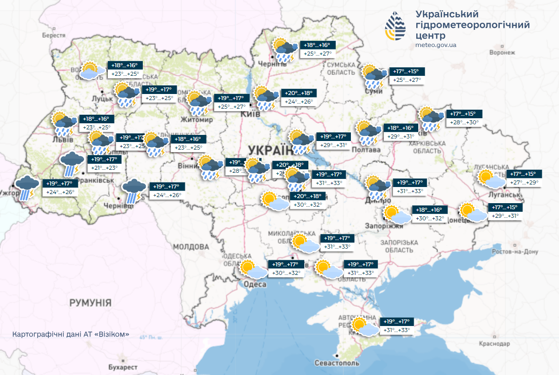 23 червня у більшості областей очікуються дощі та грози. Температура вдень сягатиме до 29-34° тепла.
