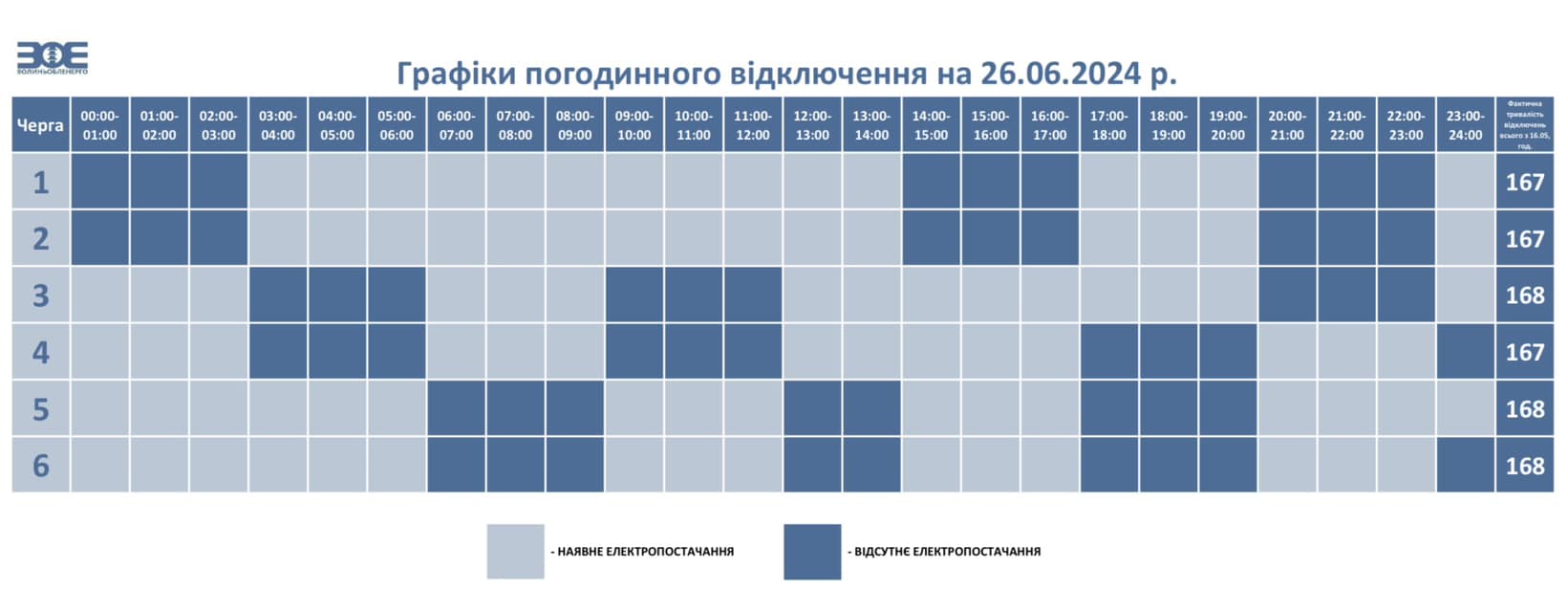 У середу 26 червня у Волинській області діятимуть графіки погодинного відключення електроенергії.
