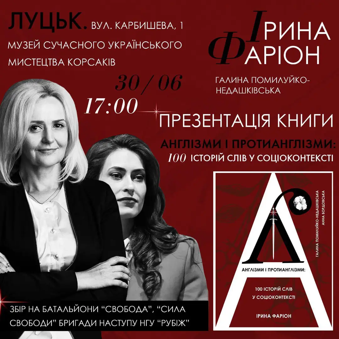 У Луцьку 30 червня, в неділю, о 17:00 відбудеться презентація книги Ірини Фаріон (у співавторстві Галина Помилуйко-Недашківська, Анна Бордовська) «Англізми та протианглізми: 100 історій слів у соціоконтексті» у МСМК.