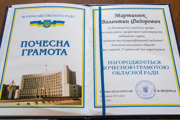 За багаторічну сумлінну працю, високий рівень професійної майстерності, відданість справі, надання висококваліфікованої медичної допомоги населенню області, Григорій Недопад вручив ювілярові Почесну грамоту обласної ради.