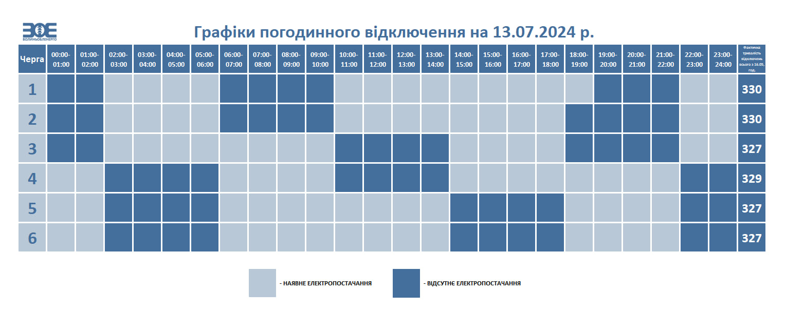 У суботу, 13 липня, на Волині діятимуть графіки погодинного відключення електроенергії.