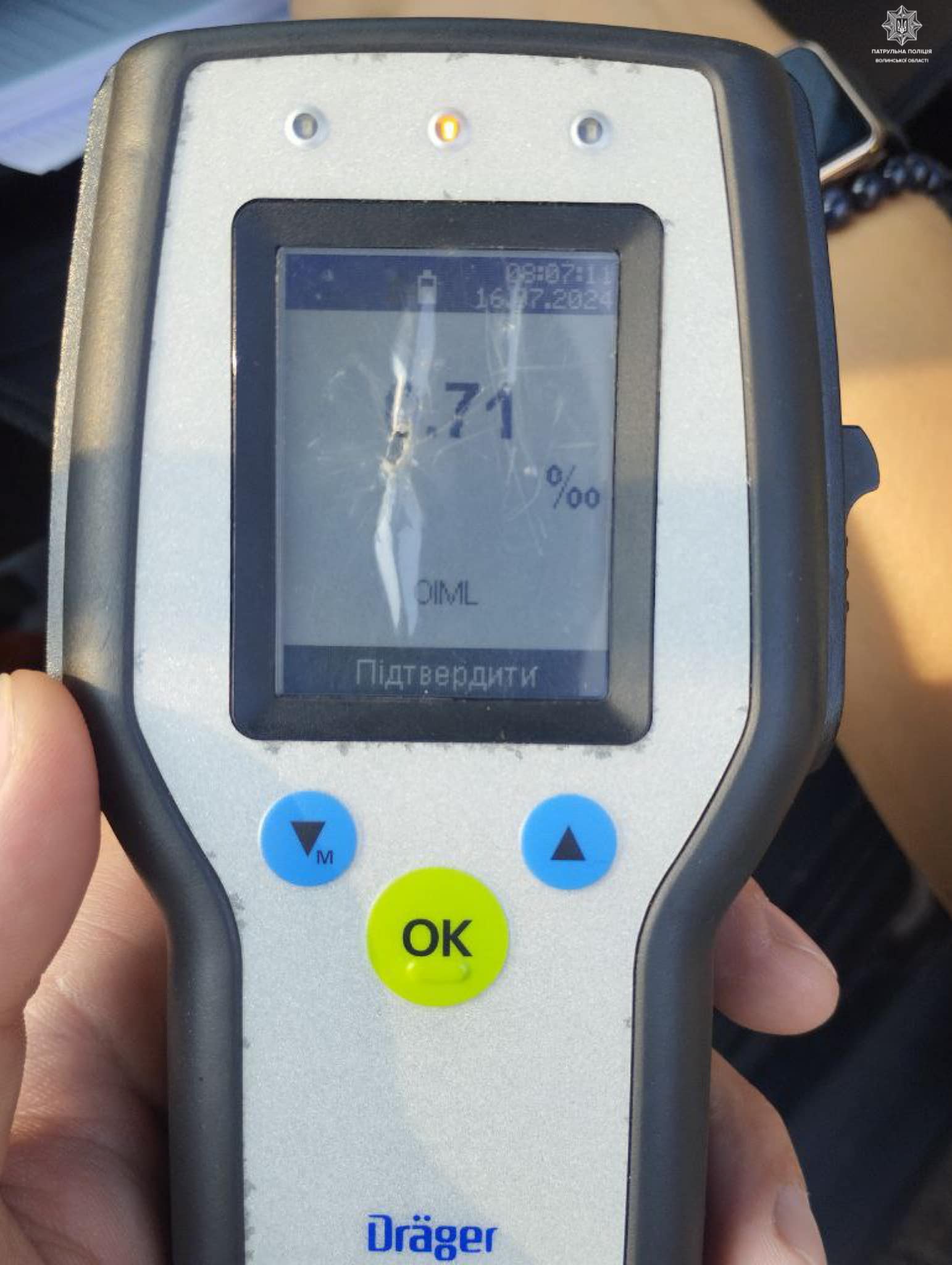 Під час спілкування інспектори помітили, що у керманича присутні характерні ознаки алкогольного спʼяніння. 34-річний громадянин пройшов огляд на місці зупинки. Результат - 0, 71 проміле.