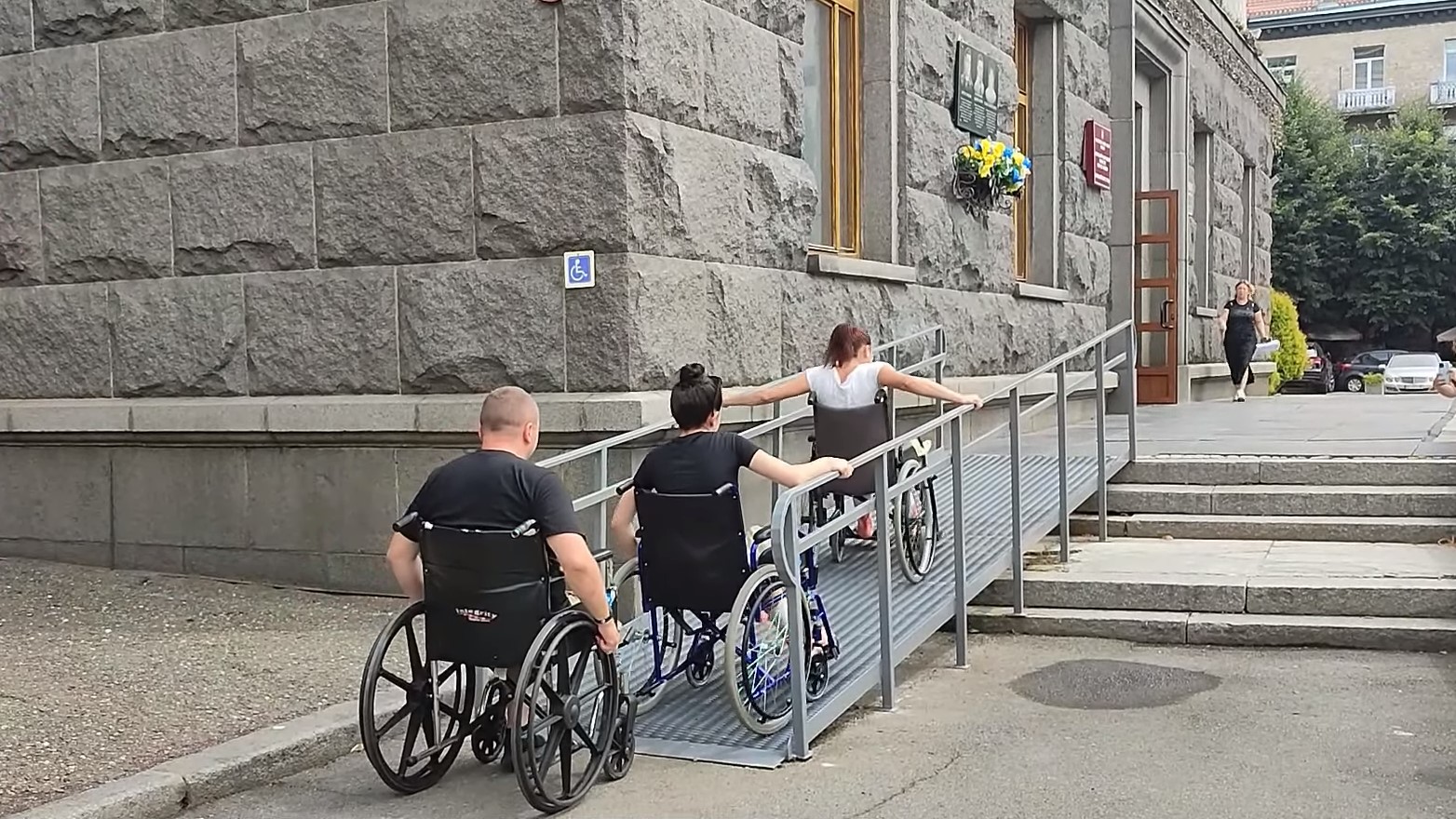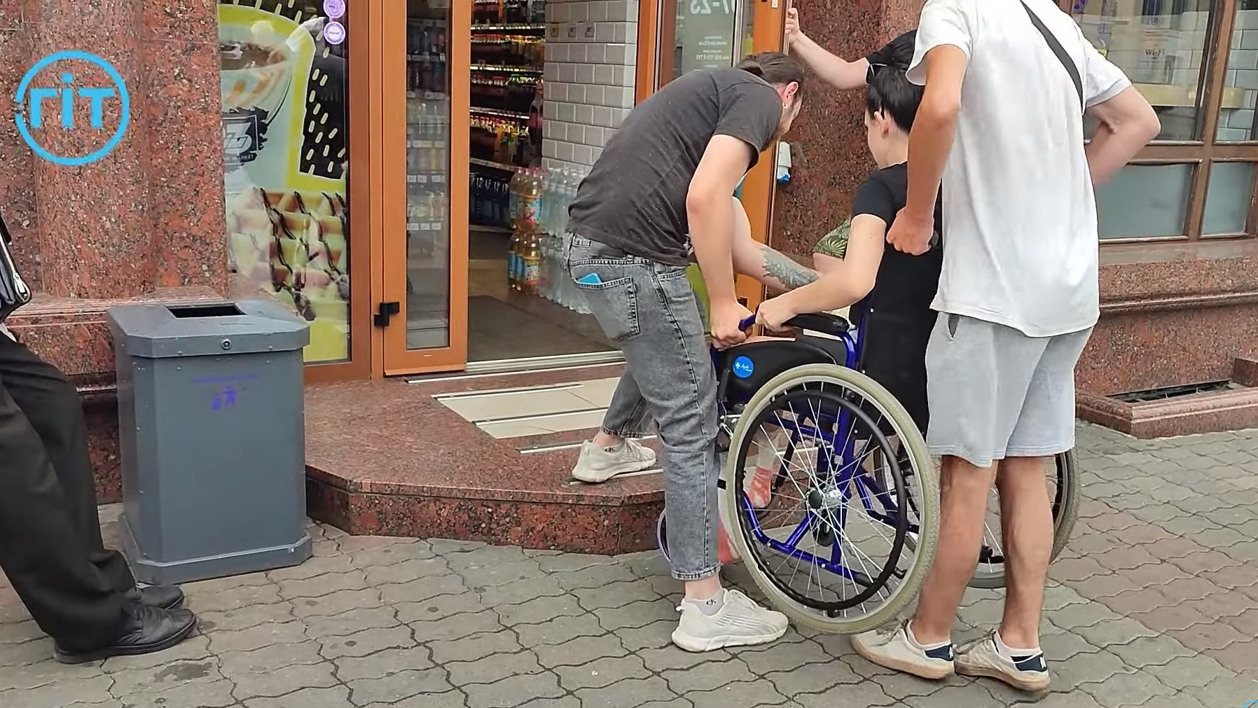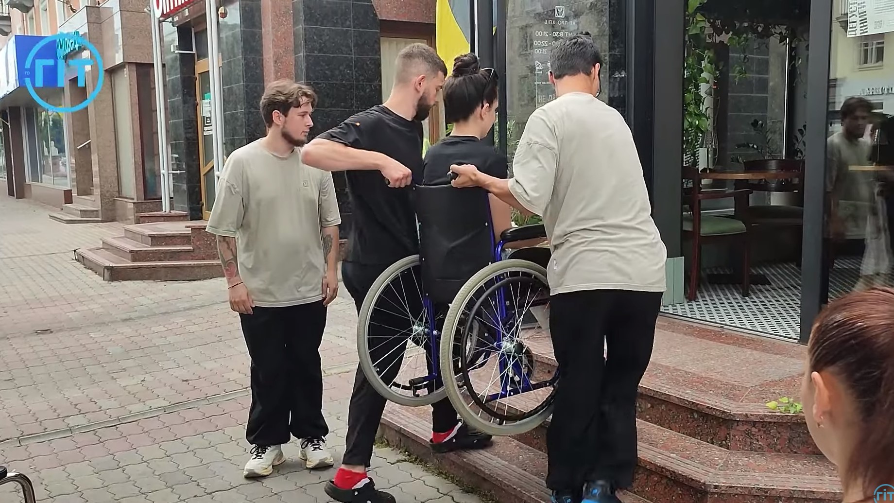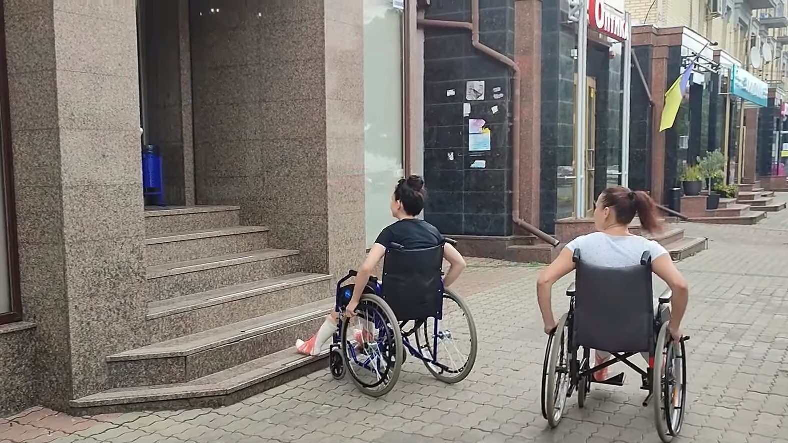 Щоб потрапити до ще одного супермаркету, Дарині довелось просити допомоги у перехожих, адже пандусу немає. Чоловіки підняли крісло разом із дівчиною на сходинку та допомогли заїхати у приміщення.