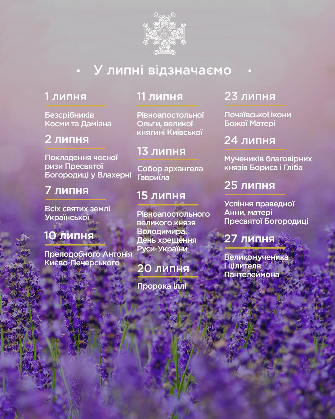 24 липня – благовірних князів Бориса і Гліба, 25-го – Успіння праведної Анни, матері Пресвятої Богородиці, а 27-го – пам՚ять великомученика і цілителя Пантелеймона.