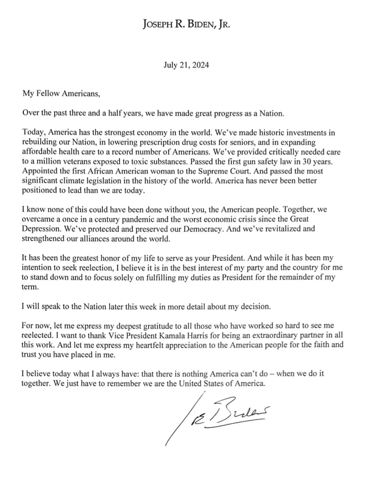 Хоча моїм наміром було знову балотуватися, я вважаю, що це в інтересах моєї партії та країни – відійти в бік і зосередитися винятково на виконанні обов'язків як президента протягом теперішнього терміну, – йдеться в заяві Джо Байдена.