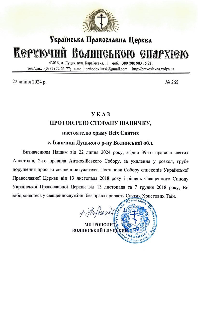 «Настоятель храму Всіх Святих с. Іванчиці Луцького району протоієрей Стефан Іваничко за ухилення в розкол, грубе порушення присяги священнослужителя заборонений у священнослужінні без права Причастя Святих Христових Таїн», - йдеться у дописі.