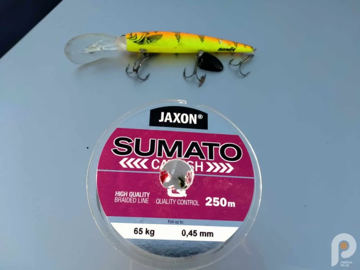 Показує нитку і воблера, на які упіймав свій трофей.