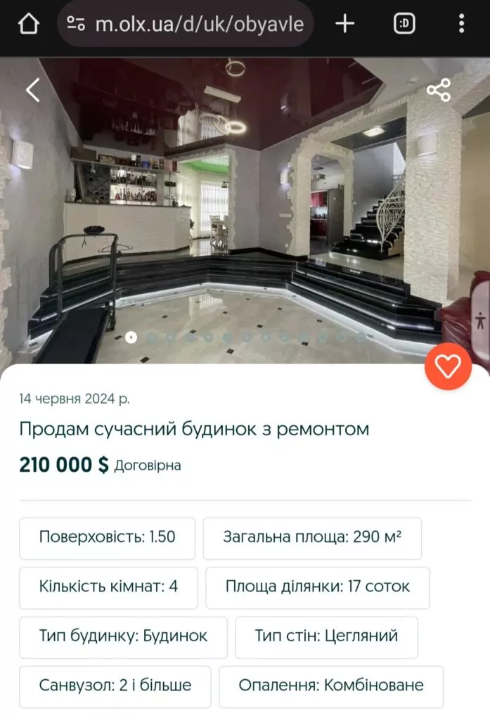 Відповідно до опублікованої інформації, будинок – новий сучасний цегляний, загальною площею 290 кв.м та земельною ділянкою 17 сотих. У хаті є кухня столова, велика вітальня, спальня, дві кімнати, дві ванні. Також облаштований холодний підвал, гараж на два автомобілі, технічні приміщення, барбекю з навісом, зимовий сад, вбудований пилосос.