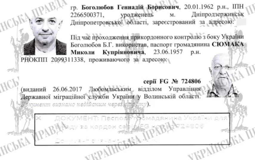 Бізнесмен Боголюбов виїхав по паспорту 67-річного Миколи Купріяновича Сюмака, якого вдалося знайти журналістам. За словами Сюмака, він загубив закордонний паспорт ще навесні 2022 року, а з 24 червня 2024 року він не покидав Україну і наразі перебуває вдома.