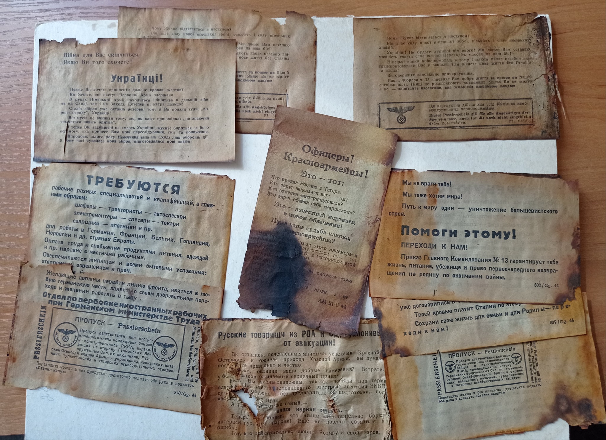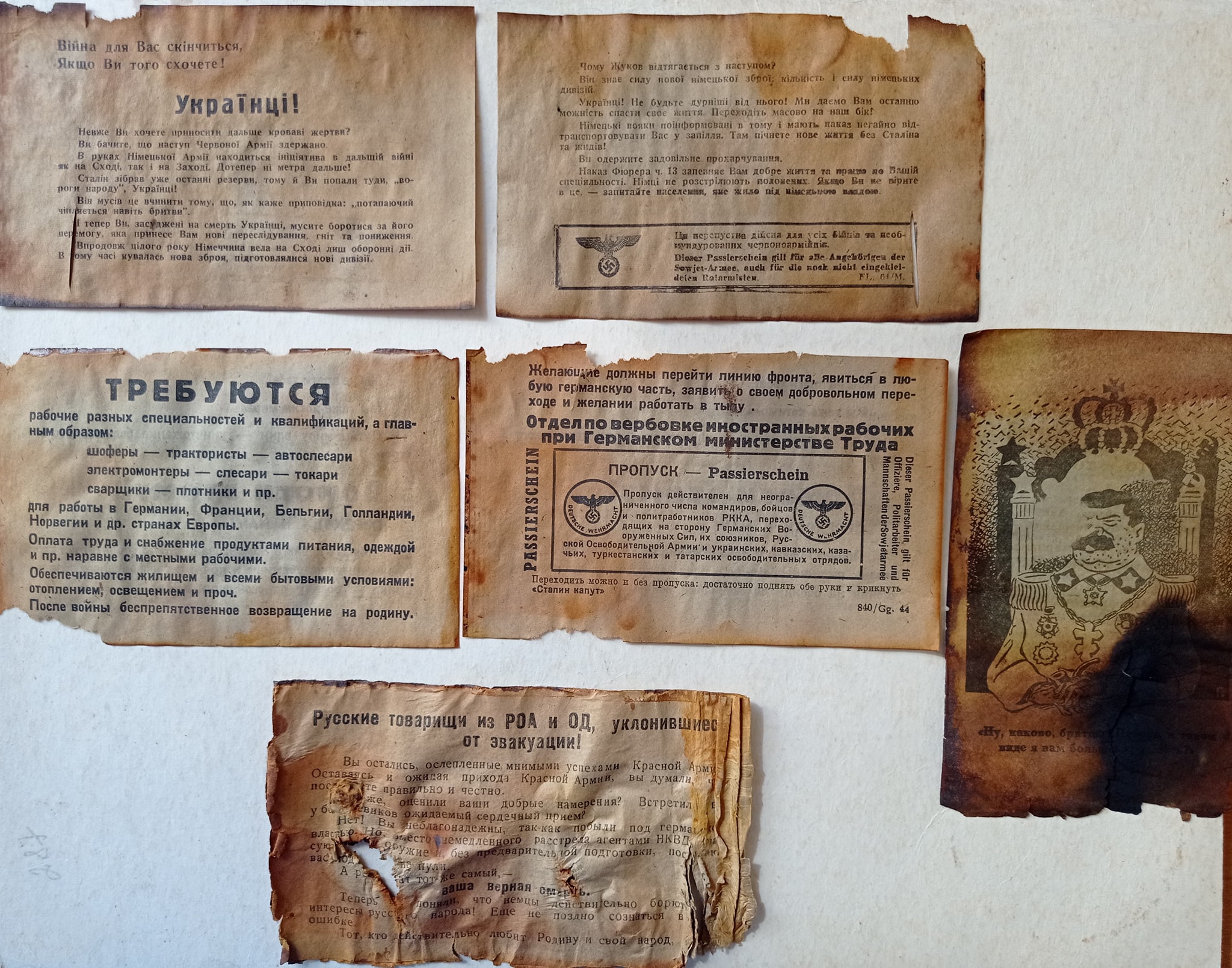 «Листівки пожовклі і обгорілі. Також, ймовірно через доступ вологи, папір зотлів й розсипається в порох. Проте тексти російською мовою розбірливі і цілком читальні. Три листівки з текстом українсько мовою і закликами переходити на бік Третього Рейху. Пропагандистські технології завжди є невід’ємною частиною самої війни і мають на меті впливати на армію противника та населення окупованих територій», - наголосили в історичному музеї.